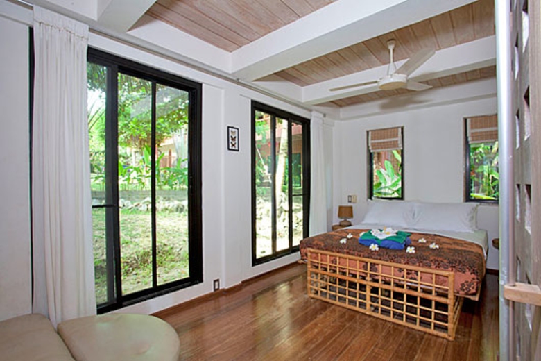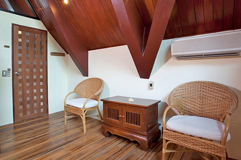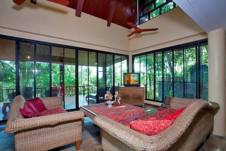 The living area has floor to ceiling glass windows and doors with a high vaulted roof space. There is a wicker-seating suite around a matching coffee table with a good view of the TV, terrace, and the surrounding gardens. Suspended ceiling fans offer the chance to relax in a truly tropical atmosphere. as a change to the air-conditioning.