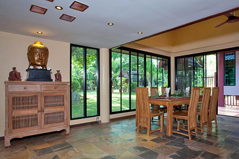 The large dining area on stone tiles features a wooden antique-style table and six chairs with a matching sideboard adorned with Asian artefacts. There are also plenty of al Fresco dining options both around your villa and within the resort.