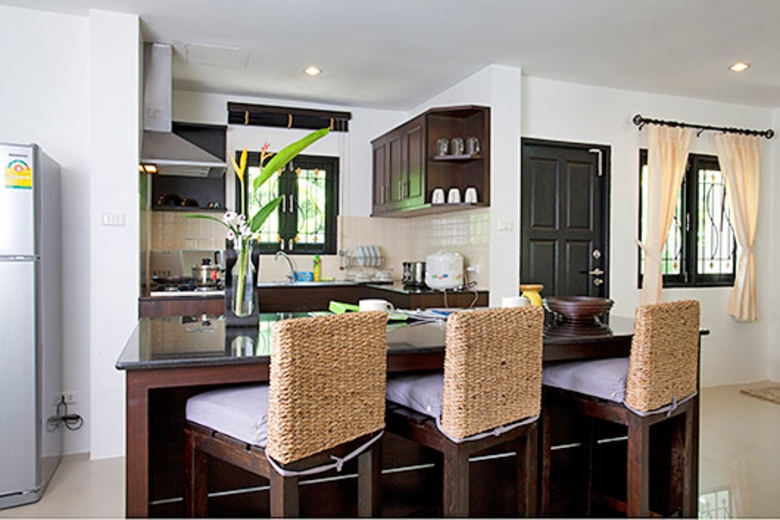The open plan living space in the villa provides lots of space to unwind and relax. With a lounge, kitchen and dining room rolled into one spacious area, everything is conveniently located at arms’ length. Relax on the wicker settee and take in a movie or two on the large flat-screen TV and DVD player. You can also take advantage of the satellite TV options with international channels. This is large and spacious tropical open-plan living at its finest. Combining a lounge, kitchen and dining room rolled into one, you have lots of living space to relax within. Imaging kicking back on the comfortable wicker settee and enjoying entertainment features such as a large flat-screen TV with international satellite channels and a DVD player. The six-seat dining table is also situated directly between the kitchen and lounge for added convenience.