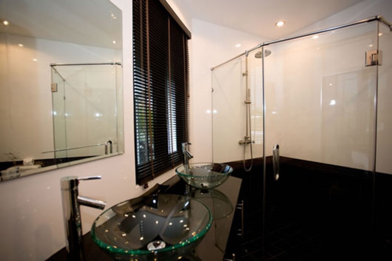 The master bedroom has an ensuite bathroom with twin tinted glass wash bowl sinks with designer faucets and fittings set onto a black granite countertop. There is a very spacious coordinated glass enclosed stall shower with an adjustable height shower head for personal use.