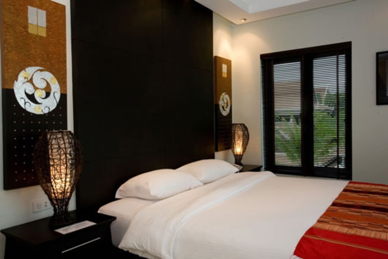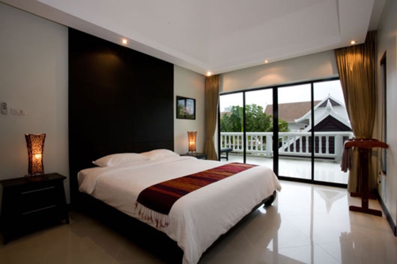 BedroomsAll three bedrooms are upstairs and have queen size beds fitted with high quality sheets and extra large pillows. Two have sliding doors opening onto balconies which afford views of the surrounding countryside. Like the entire house, all three bedrooms are decorated with Thai silks, lamps made from local natural materials and traditional artwork on the walls.