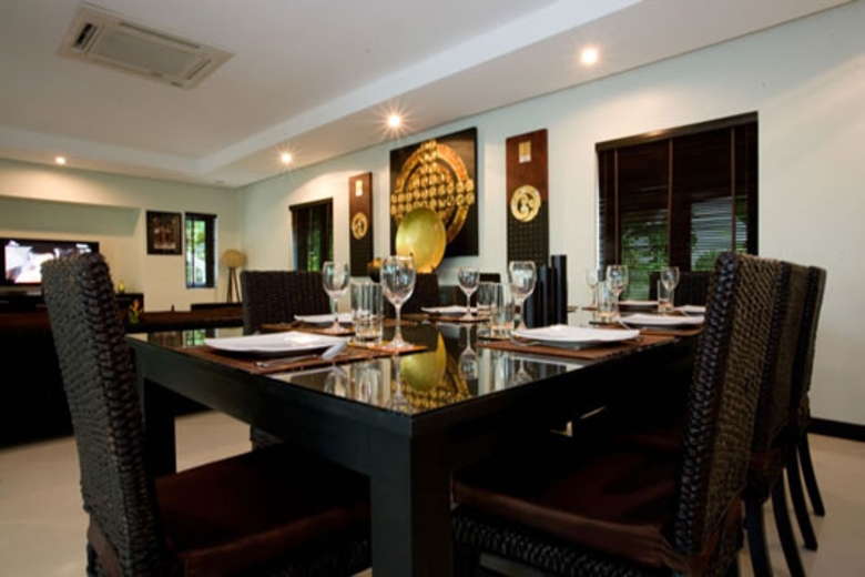The open plan of the home places the dining room strategically between the living room and kitchen, offering an elegant glass topped wooden table and eight comfortable braided water hyacinth chairs. Designer place settings, cutlery and glassware add an artistic flair to meals and encourage long after dinner conversational get-togethers.