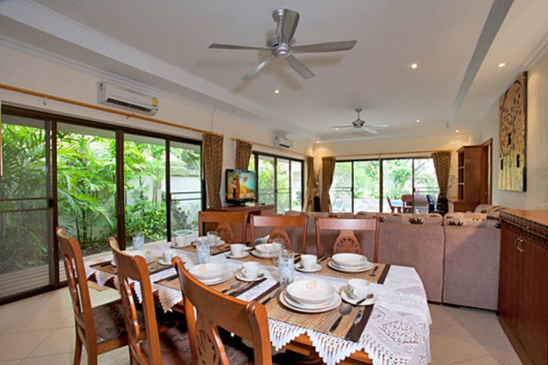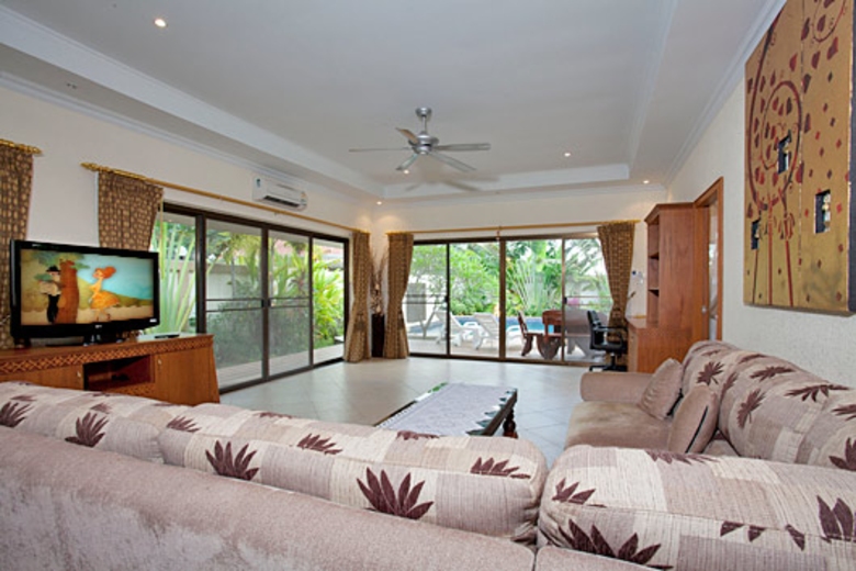 The spacious living room has a comfortable L-shaped sofa arrangement for kicking back and relaxing whilst watching the large flat-screen TV with international channels. A ceiling fan here offers an alternative to air-conditioning especially when the many patio doors are opened up to allow the Pacific breezes to waft in through the mosquito screens.
