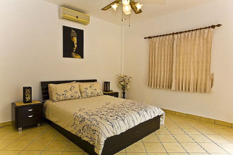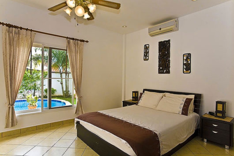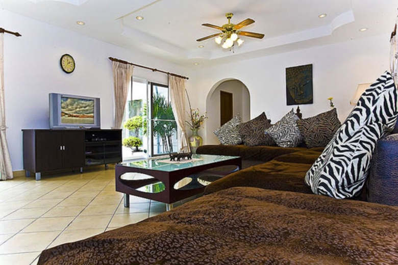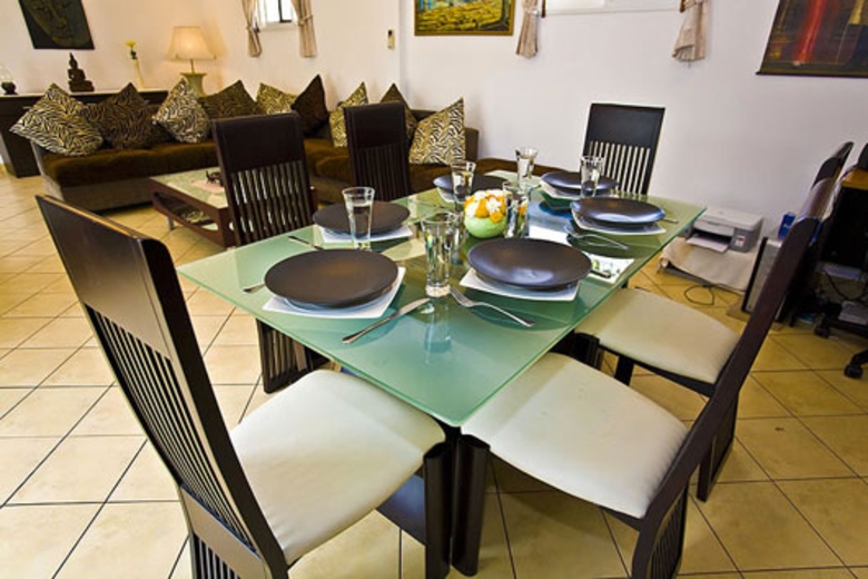 The first thing you will notice when visiting Baan Orchid is that the garden is very shaded, due to the selection of trees and the tall perimeter wall, which also provides you with seclusion and security. Here you will also find a private swimming pool with an integral Jacuzzi that also adjoins an area with sun loungers.The garden is also home to an outdoor dining area, which is the ideal foil for your al fresco dining pleasures. From the garden, you can easily access the main living areas through twin French doors where you will find an inviting lounge, dining room and a fully equipped kitchen. The lounge is uniquely decorated with rich colours that gives Baan Orchid an African feel, especially with its zebra skin coloured cushions and dark brown settee.