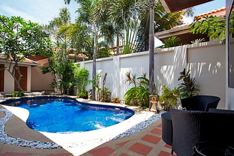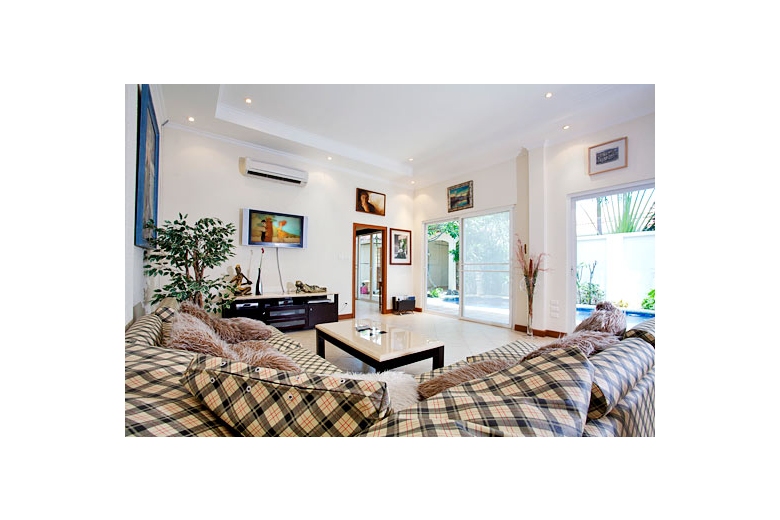 There are some properties that successfully merge a perfect holiday location with luxury and affordable rental rates – and Baan Tawan 2 is the pinnacle for this criteria. Just 500 meters from Cosy Beach at the convenient Pratumnak Hill area, ideally positioned between both Pattaya and Jomtien, this is the perfect holiday location for singles, couples and small families alike. The villa is situated on a private yet quaint estate with just four other villas with overnight security. Surrounded by a tall perimeter wall that aids superb seclusion and privacy, Baan Tawan 2 is a place you can relax around the pool on the cosy garden without prying eyes. Immediately when you walk through the entrance doors to the garden, you will feel at home within the warm embrace of this excellent Pattaya rental home. You will see the private swimming pool with its adjoining covered terrace area, which is ideal for taking that relaxing drink. You can access the main living and bedroom areas from the garden through the surrounding patio doors. The villa was designed in an L-shape format that clings poolside from every area. The villa has two bedrooms, two ensuite bathrooms, spacious and luxurious ling and dining areas, and a European standard kitchen ideal for self-catering.