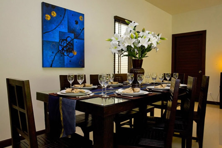 The apparent ingenuity of design and the surprising order and coherence of the decoration in the living area prove the utmost dedication for comfort and excellence. Marked with style and creativity, the U-shape leather settee renders a unique look. You can sit back on the sofa and have the satisfaction of looking directly to the scenic beauty of the garden and the swimming pool, or have a cup of coffee in the lounge while you watch the 42 inch flat-screen TV (with selections of international channels) which also has a DVD. Enjoy looking at the exquisite Asian paintings displayed within the living room.
