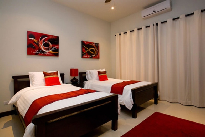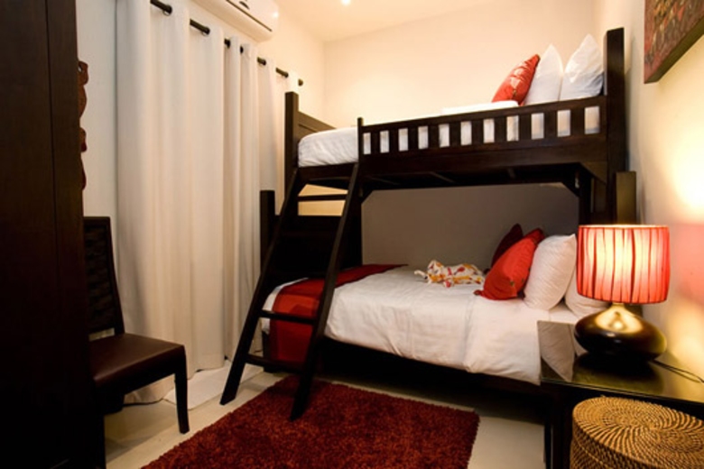 BedroomsThe four bedrooms have pristine white walls, ceilings and flooring, fitted with decorations and fixtures in deep red colors - a contrast of hues that renders a vividly apparent lively ambience. The villa has four bedrooms that can accommodate nine persons. The master bedroom has a beautifully crafted four-foster bed (with red pillows and white mattresses) with expansive glass windows providing a refreshing view of the garden. The second guest room has twin beds while the remaining two bedrooms have a double bed and a bunk bed.
