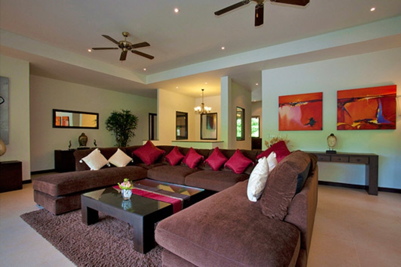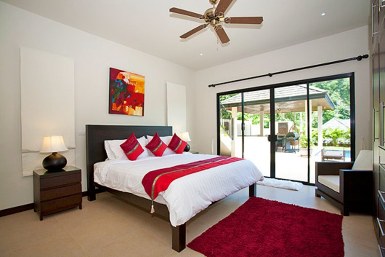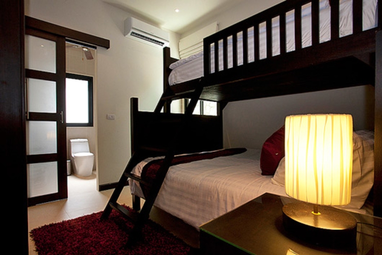 Coral Villa in Phuket includes three stairways leading to various areas of the luxury accommodations. The front stairway invites you to visit the balcony living room sala including adjacent dining area. A second main stairway leads to the master bedroom and master guest room as well as the second floor kitchen. The rear staircase of the villa leads to the sports room and gym area. This Phuket villa features air-conditioning throughout providing ultimate comfort no matter what the temperatures threaten to climb to outdoors in this tropical paradise. An additional maid’s quarters and laundry area is also included within this Phuket villa rental. The outdoor pool area features an oversized infinity swimming pool, where even larger families or groups of friends can enjoy a swim together, and an outdoor pool dining area that can accommodate up to eight persons.