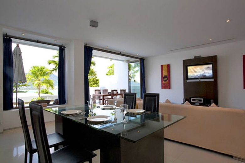 The large soft cushioned L-shaped settee sala invites total comfort and relaxation for home viewing from a wide screen wall-fitted flat-screen TV with satellite channels, or stereo sound listening to music from a DVD player or I-Pod as you gaze out towards the calm Andaman Sea from afar. There is also Wireless internet access at your disposal. A wide paneled sliding door leads to the infinity edge pool with sundecks and patio table.