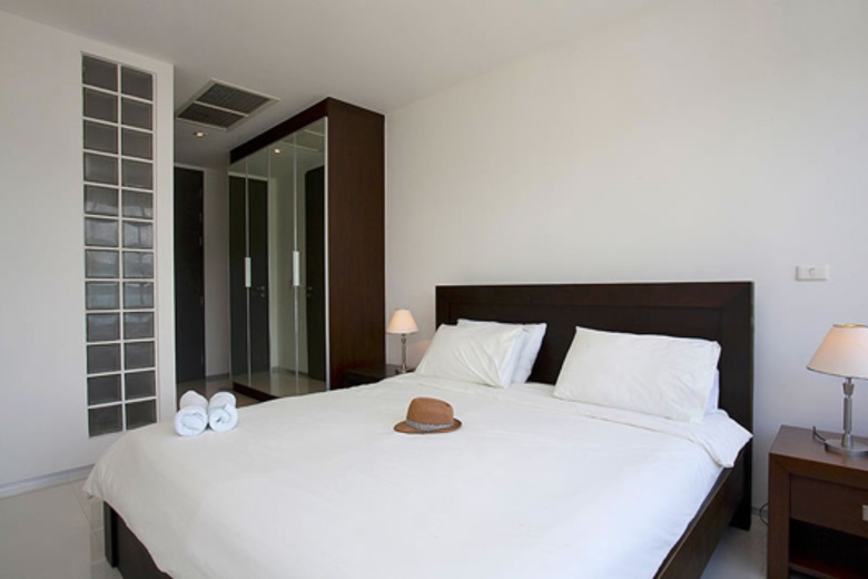 The two bedrooms enjoy a full view of Patong Bay, with its sliding glass doors that opens to a sun terrace with rattan lounge chairs and table. From the master's floor level area, you walk up to a 4-step ladder to a large mirrored-door closet and a state of the art bathroom encased in full glass walls so you can still enjoy the sea-views even when in the lavish comfort of a bathtub or shower.