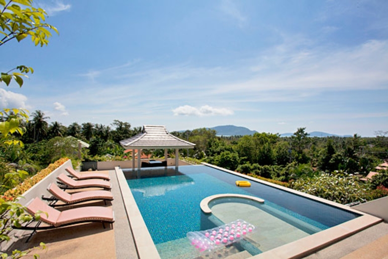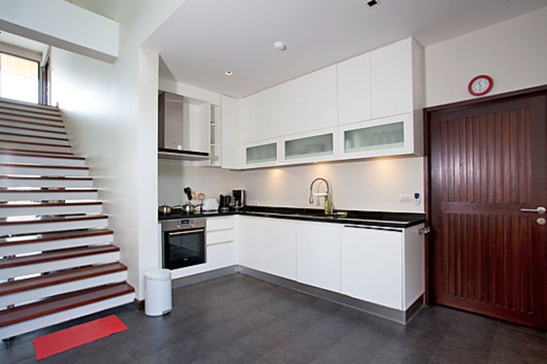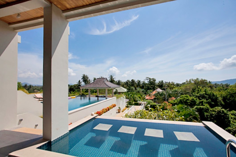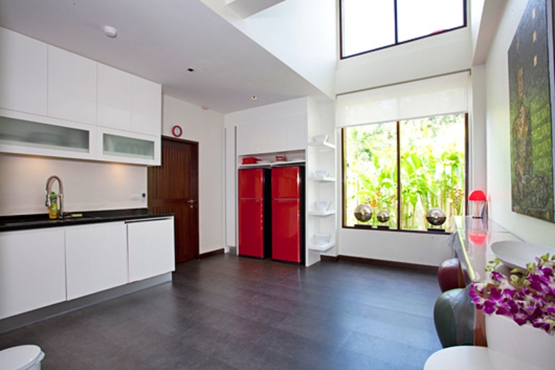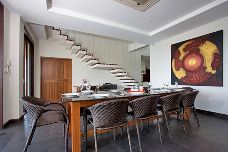The dining room is also open plan and flows from the living room on the second floor with seating for 16 guests at a Thai marble table. With high ceilings, the approach in its décor is minimalist yet tasteful. The terrace also has outdoor seating for five more people on two small tables with a direct view of the large pool below which has four sun-loungers, and four chairs under its own sala/shade for those lazy days when you wish to relax in the tropical heat.