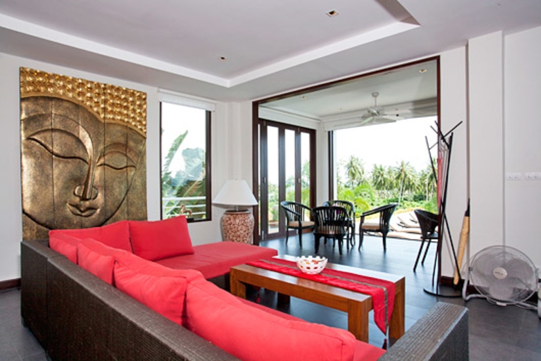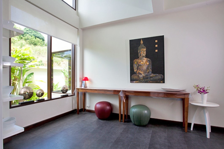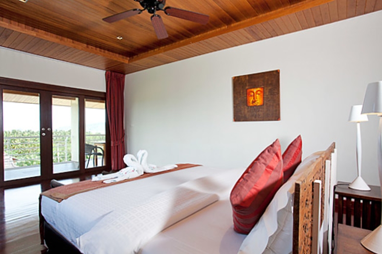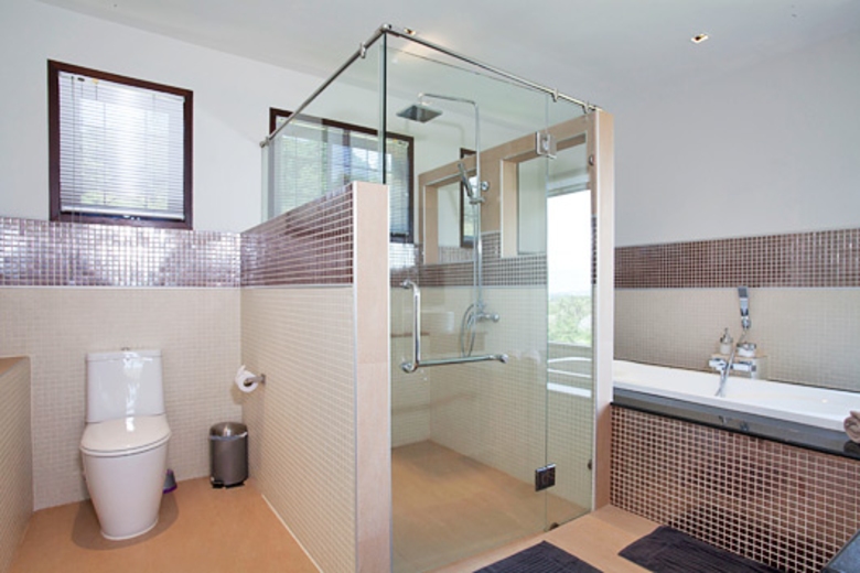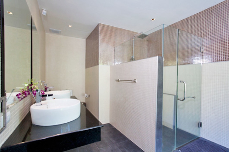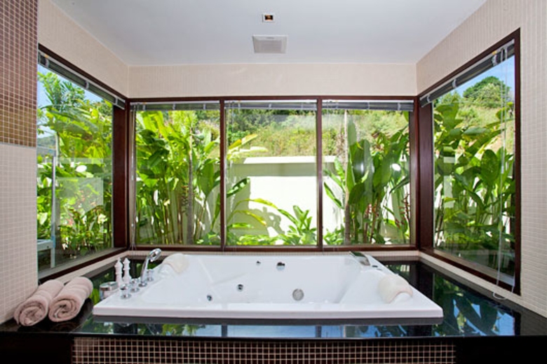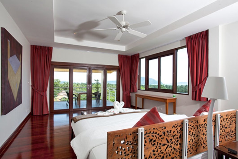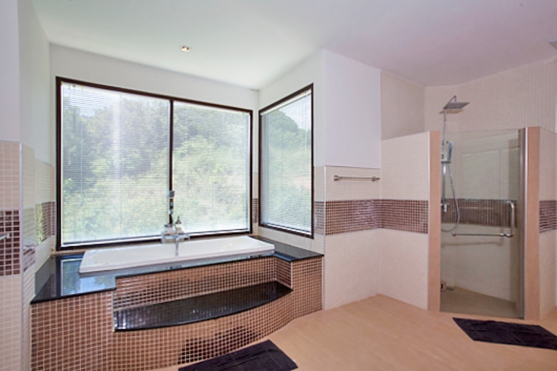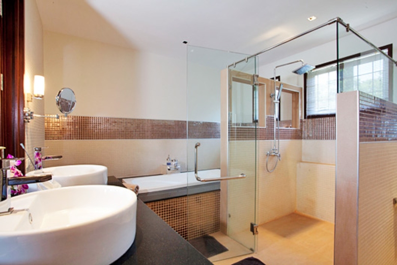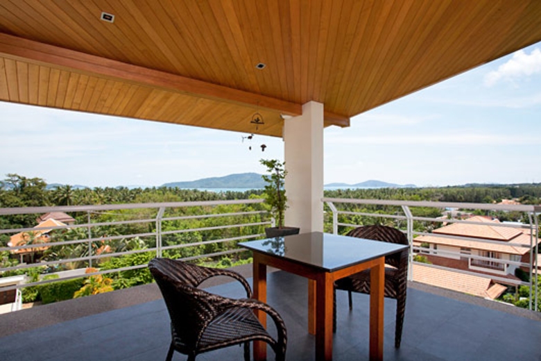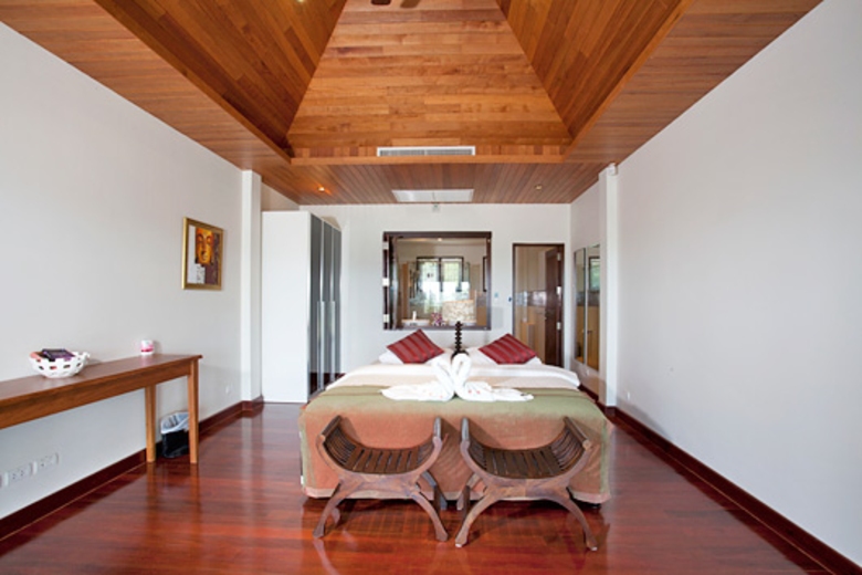 Bedrooms Ocean Villa offers absolute luxury and contemporary Asian design. It has 6 spacious bedrooms, all complete with ensuite facilities, which all have ensuite bathrooms and wooden floors adding to the ambience. All the bedrooms have good views, with king and queen sized beds and are also all fully air-conditioned with fans. Another bedroom near the living room has a double bed, TV and satellite box, fan overhead, with a patio behind for table and 2 chairs and an ensuite bathroom. There are also spare foldaway beds in two of the three bedrooms upstairs, which mean this villa can sleep 12 adults with room for an additional 3 children, sleeping in the foldaway beds.On the ground floor, you will find the master bedroom (1) with a king sized four-poster bed, which gives the room a very grand appearance. The master bedroom has amazing views over to Phuket City, the beaches, and the surrounding mountains and has its own private access to the pool area. The master en-suite bathroom has a Jacuzzi bath for 2 people, shower, washbasin and WC.