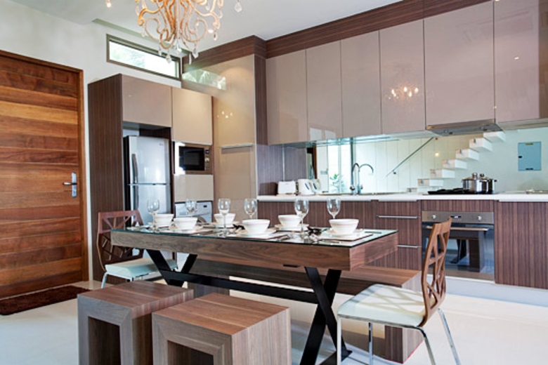 Next to the kitchen and the living area is a wooden glass-topped dining table which can fit six guests comfortably. There is also a side table and two cushioned chairs for casual small meals.