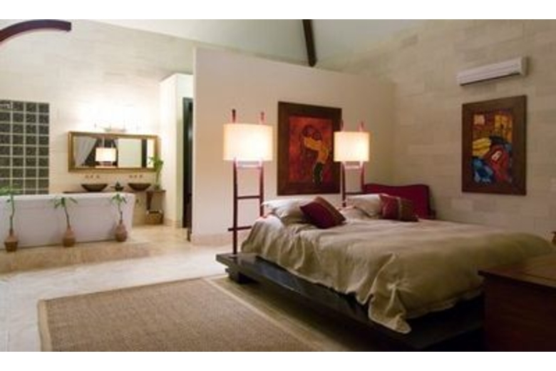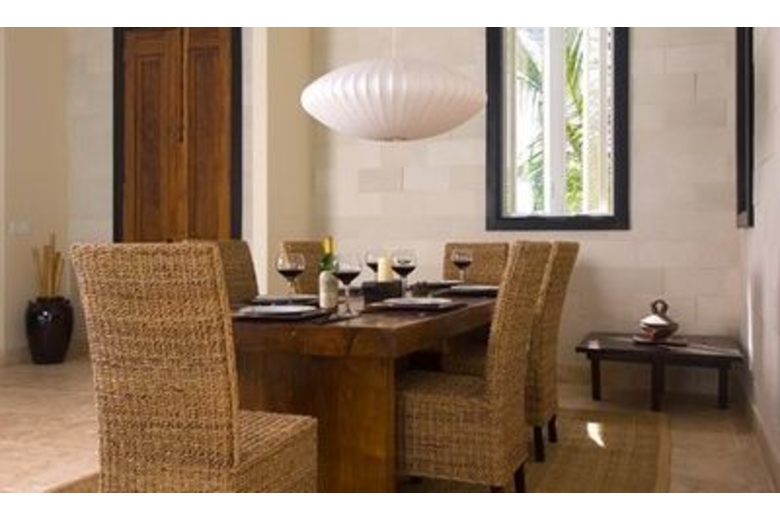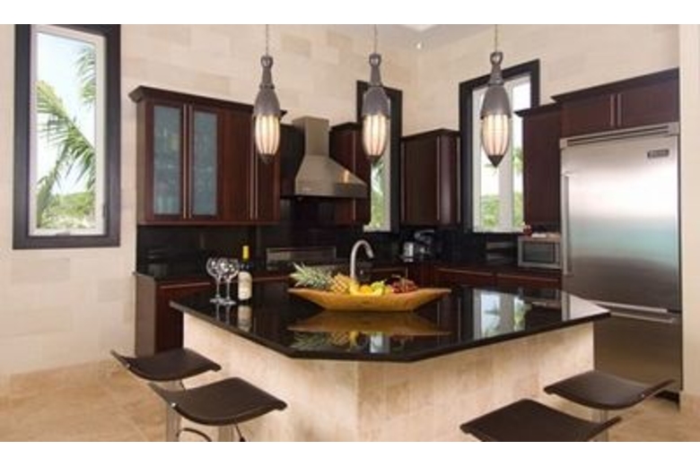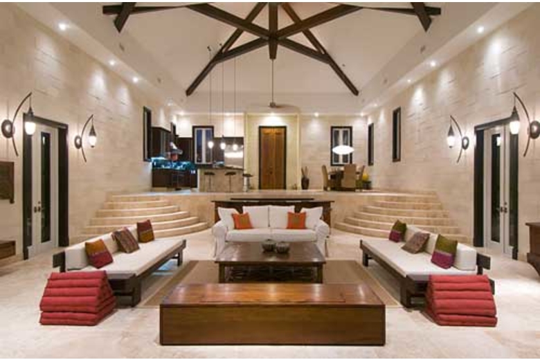 The kitchen is fully equipped. Stunning ocean views fill the entire great room as one progress to a large sunken living room with adjoining granite bar. The master bedroom wing adjoins the angular pool and comprises a suite with 90 degree glass doors looking out to sea. Each of the guest rooms has a private balcony furnished with handcrafted Balinese daybeds. The stunning centerpiece of the Villa's living and terraced pool area is the three-angled over sized infinity pool constructed in emerald green stone. A limestone walkway leads to the ocean. The pathway continues down to the ocean, accessed by several steps for a delightful swim.Surrounding Description