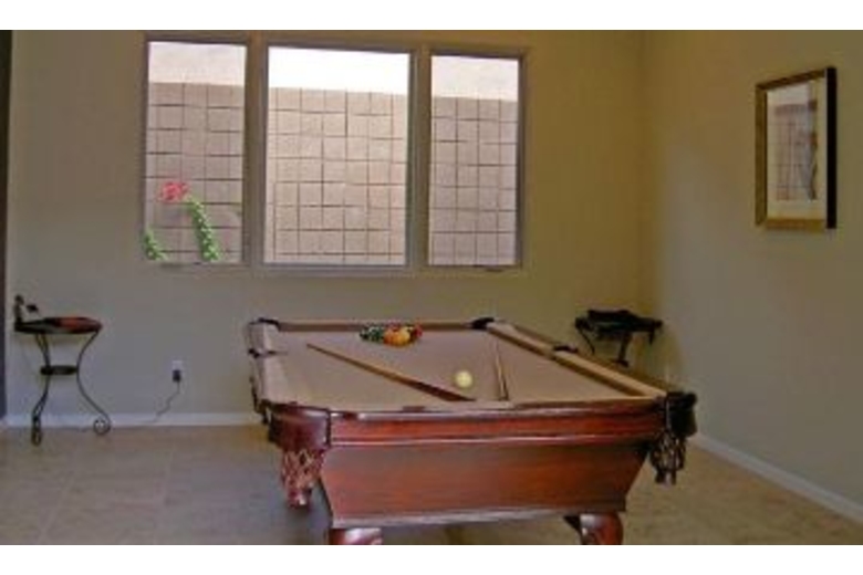 The home has travertine tile throughout all the high traffic areas. The spacious living room has leather and wood furnishings, Big Screen TV with DVD, 5.1 Surround Sound and large view windows. The tropical backyard pool has a waterfall with two fire features, fogging system that creates a fine mist over the water, multi colored pool lights, two resistance jets located at the deep end for swimming laps, in-ground hot tub, gas fire pit with semi circular seating and a built in stainless steel BBQ with a smoker.Surrounding Description