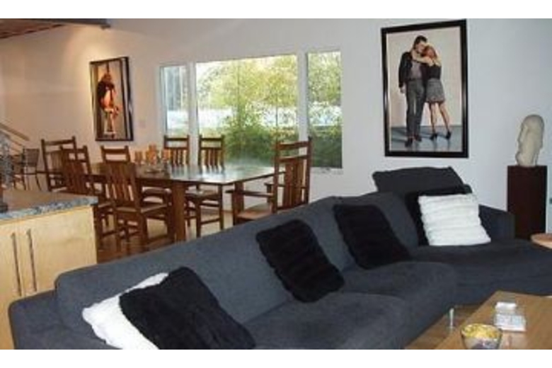 All of the floors in this prestigious home are maple, as are the cabinets in the kitchen, pantry and master bathroom. The kitchen features a sub zero fridge, Viking gas stove, Bosch dishwasher, industrial style--sink and counters, granite 13 foot island, with stools on one side, high end dishes and stainless tableware. The living area offers plenty of seating for your group and a gas fireplace. The furniture in the living area is comfortable but high end modern Italian. The art throughout the home is eclectic and interesting. Linens and towels are included, as is a washer and dryer. The master bedroom offers a private deck, a king size bed, office, and large bathroom. The master bathroom includes a whirlpool tub, dressing room/walk-in closet with a laundry chute, marble vanity, and double sinks. The second bedroom offers a queen bed, bathroom, walk-in closet, antique oak dressers, wrought iron bed, and TV. The third bedroom is located one half level up from the main floor, in the back of the home and also serves as a family room. This room boasts a queen convertible sofa. Additional amenities include phones and answering service, Sony computer, sand toys, boogie boards, stereo indoors and out speaker system, and internet.Surrounding Description