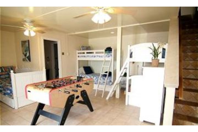 The living area offers a flat screen TV and a beautiful fireplace. The view of the ocean from this room is spectacular. The kitchen is elegant and offers very nice appliances including a microwave and coffee grinder. This retreat features three king beds, one queen bed, two full beds, and eight twin beds. The kids’ room in this home is fabulous, featuring bedding for six and a foosball table.Surrounding Description