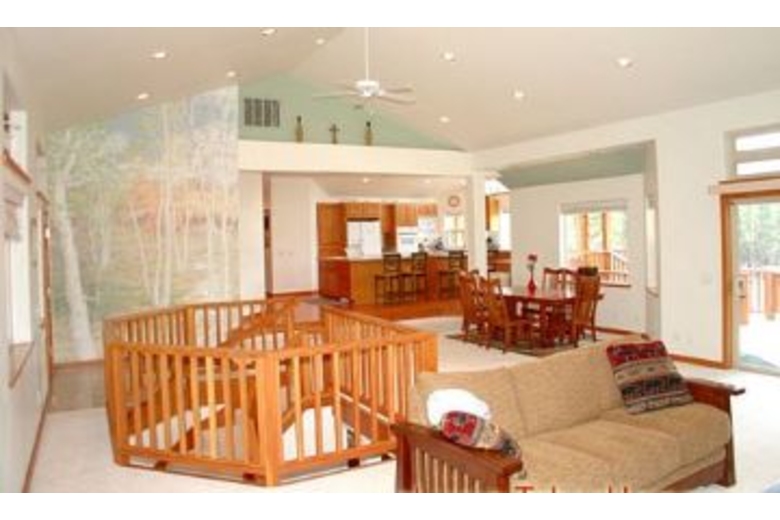 This mansion features, on the 1st level, a kitchen, master bedroom/bath, guest bath, dining and living room with fireplace. On the 2nd level there are three more bedrooms, family room with fireplace, bar, rec room, theater room and laundry room. On the 3rd level there are two bedrooms; one with shower and sauna, toilet, the other with a big shower and tub combo and toilet, and of course the hot tub and luxury indoor swimming pool. High-speed internet service is available. There are 2 wood burning fireplaces in the property. Do not use the gas to light the fireplaces. A third gas fireplace on the lower level turns on and off with a switch. We also have a gas BBQ grill for cooking in the great outdoors. Children under 18 must be supervised by adults when using the outside decks, pool, sauna, jacuzzi baths, hot tub and pool table. Safety of the children is the sole responsibility of the accompanying adults.Surrounding Description