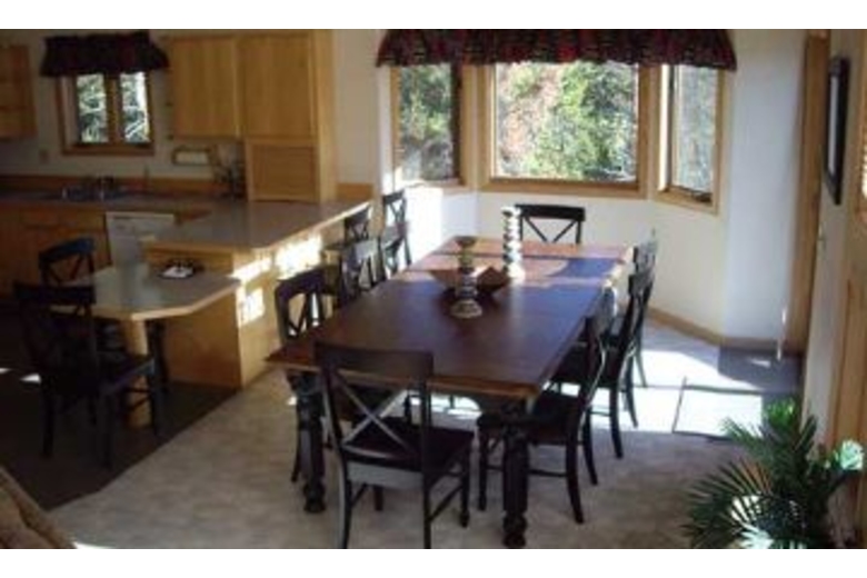 Tastefully furnished throughout with quality furniture and bedding, the first floor features an open-plan living room, dining room and kitchen, with vaulted ceiling and passive solar windows. The living room incorporates a TV with DVD player, gas fireplace, and large sectional couch. The dining room has a large eight-person table and adjoins a fully equipped kitchen with breakfast bar.