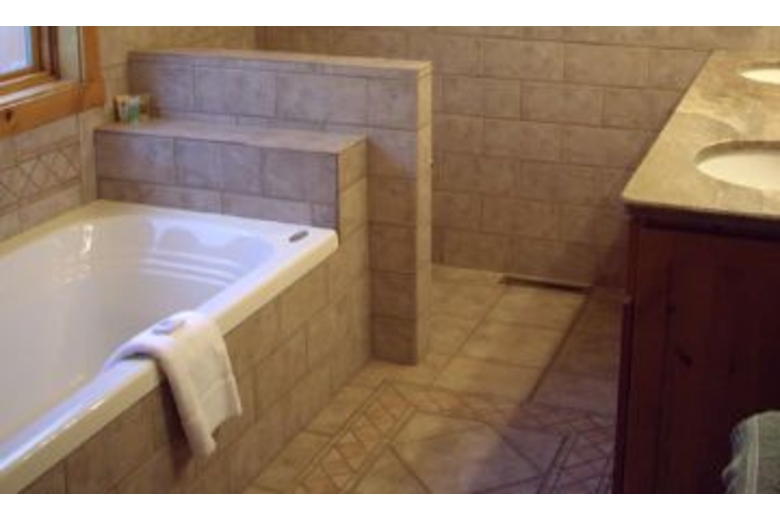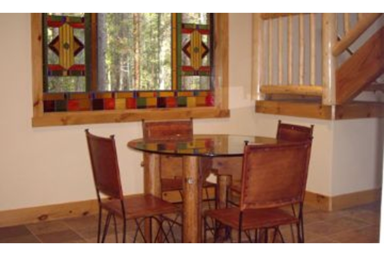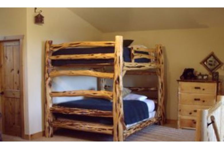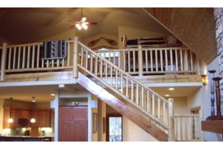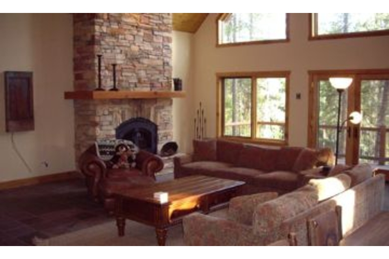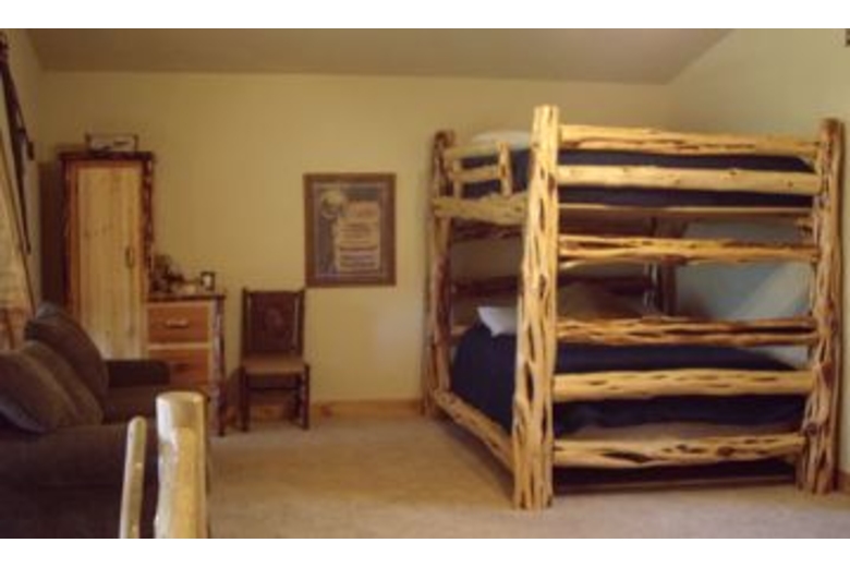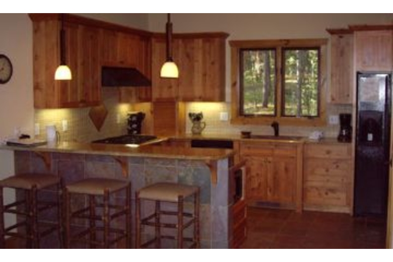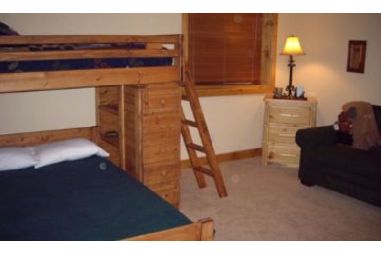 There is a fully equipped kitchen with granite counter kitchen-tops and modern appliances. Enjoy satellite TV, DVD player plus stereo are your entertainment options in this spacious room. The king-sized master bedroom is also located on the second floor with its own satellite TV, full bath, steam shower or steam sauna, walk-in closet and private deck. Two more bedrooms and two full bathrooms are located on the ground floor: a queen-size bed in one bedroom, and a set of bunks plus hide-a-bed with TV in the second bedroom. This floor also features a laundry room with full-size washer and dryer. Upstairs from the Great Room is a large lofted room with two sets of log-constructed queen-size bunk beds sleeping up to eight people, relaxation/play area, plus an additional full bathroom.Surrounding Description