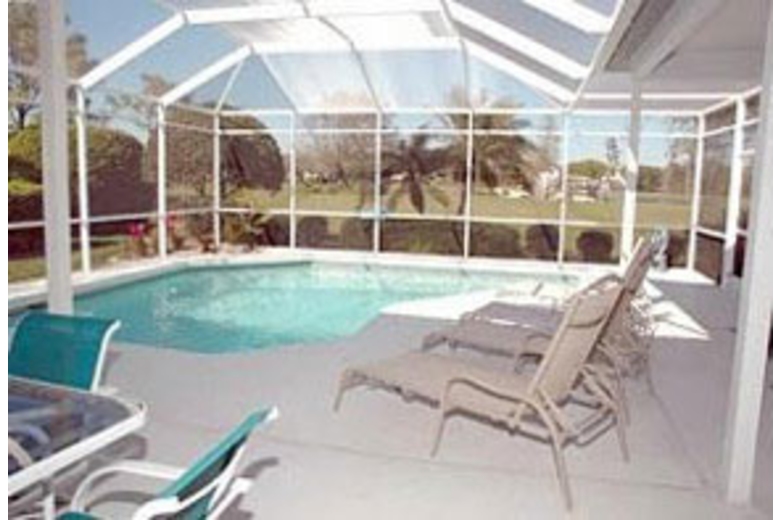 The pool is enclosed in a lanai. There is a barbeque, double garage and gardens.