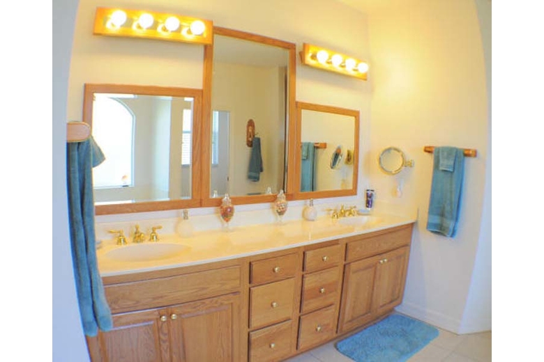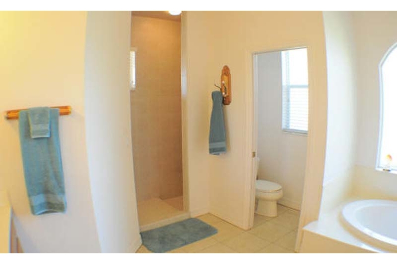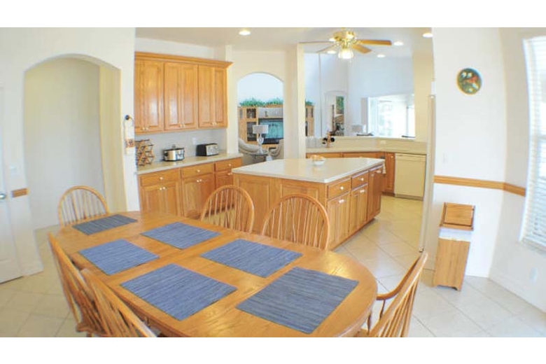 One of the most attractive features of Villa Astoria is the paved patio area. Enclosed by a white pool cage, this sun-drenched part of the property offers a dining table and chairs, lounge chairs and a gas grill. Complete relaxation and a barbecue at night is just the thing here. The covered patio is accentuated by columns and offers pleasant shade. The pool features a solar heater while the spa can be electrically heated. Take a break from the daily grind and enjoy a Florida vacation like it was meant to be!