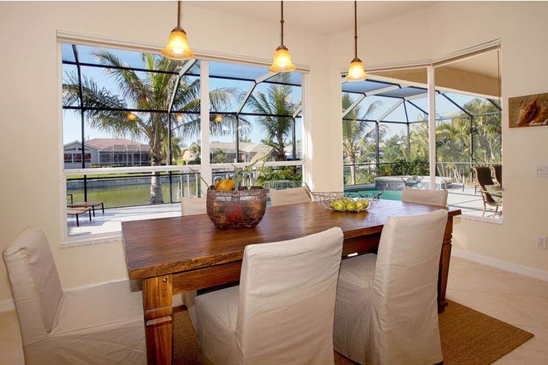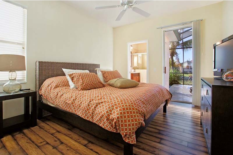 This spacious vacation home is both modern and timeless, with elegant furnishings and decorations. Rustic wood floors in the bedrooms and the office create an interesting contrast to the clean lines of the interior design. The comfortable patio furniture, the pool and spa all invite guests to spend much of their time outside. A boat lift is available to those who would like to rent a boat and experience the waterways in and around Cape Coral. Who knows, you might be able to watch some dolphins at play or catch tonight’s dinner while fishing.