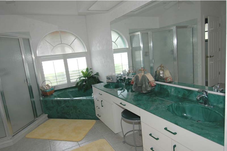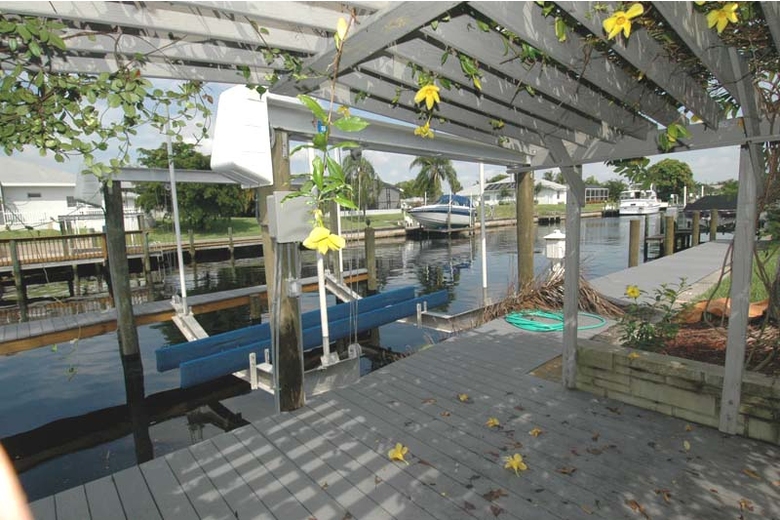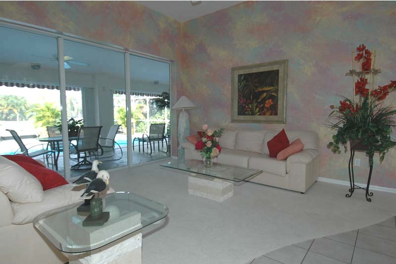 Cheerful colors of the Caribbean set the tone inside and out of this attractive vacation home located in the Palaco Grande area in SE Cape Coral. Lush tropical landscaping with numerous mature palm trees surround the property. The tropical theme continues on the patio where several planters set accents around the pool. Large windows with plantation shutters in the family room overlook the blooming garden. With its location on a sailboat canal, the home is particularly interesting to boaters, as the distance to the Caloosahatchee river is only about ten minutes. There are no bridges or boat locks to deal with.