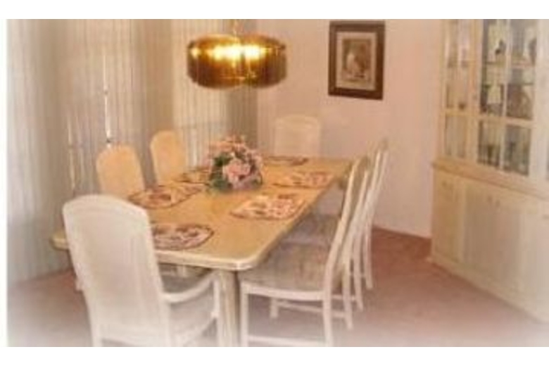 Fully equipped kitchen with bar seating, fully screened back patio area with heated pool and spa, spacious master bath, formal dining table for six, and a comfortable living area.Surrounding Description