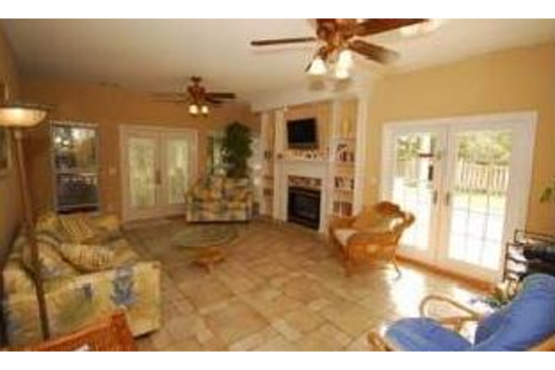 With four bedrooms, three and a half baths this spacious home features a fully equipped kitchen with microwave for quick meals or snacks, washer, dryer, fireplace, TV, DVD, VCR, internet access, screened-in front porch, enclosed deck, wraparound patio that overlooks private pool with hot tub and outdoor shower, gas grill plus parking for up to six cars. From this location, with Gulf Access, it is only one hundred yards to the beach and within walking distance to dining and shopping. Separate living quarters above garage comfortably sleeps four.Surrounding Description