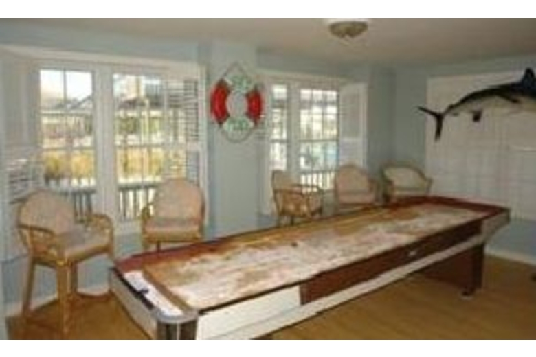 The homes exterior, reminiscent of old Florida, opens into a sleek inviting three story home with vaulted ceilings, etched glass, and unique one-of-a-kind decor with hand painted furniture and work by local artisans. Resort decor in a private vacation home. Nighthawk is ideal for a large family, multiple families or group wanting to vacation together. The home is large enough to offer separate space for various activities. The lower level features a game room with jukebox, shuffleboard, card table and entertainment area. While the homes five bedrooms, kitchen, dining area, pool table and entertainment center are located on the top two levels, theres no better way to end a day than an intimate sunset dinner of fresh seafood overlooking the Destin Harbor from the deck of your own private home or the roof top private tanning/party area - the Nighthawk.Surrounding Description