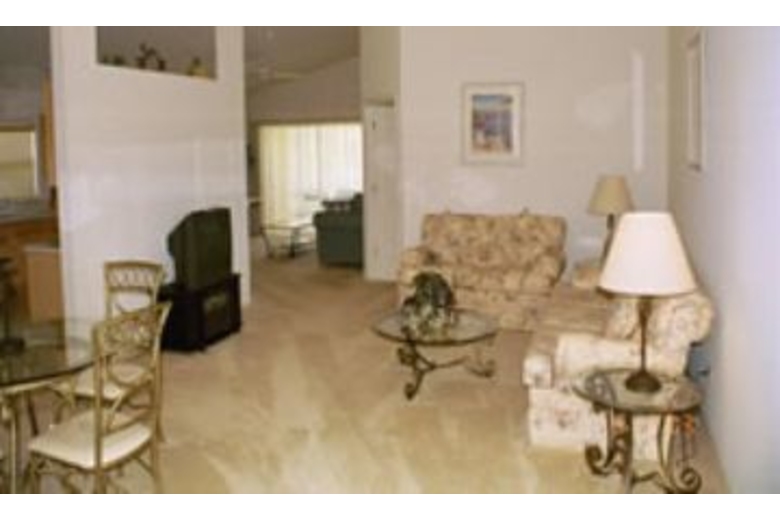 Welcome to this relaxing vacation home! The neutral color palette is throughout the home. The living room has comfortable furnishings, television, and DVD/VCR. The kitchen is nicely appointed. There are three bedrooms and two baths. The solar heated pool is screened in and has a calming lake view.Surrounding Description