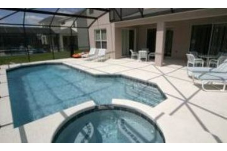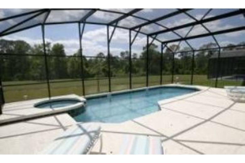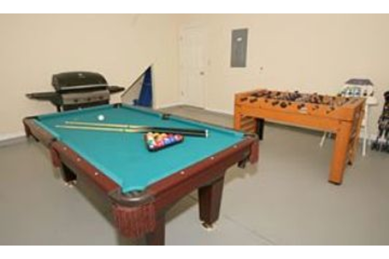 The house is fully air conditioned and has a game room with a pool table, foosball table and air hockey. The house leads onto a shaded lanai with tables, chairs, and a barbecue grill. Beyond is a screened deck area with a heated, south-facing, 30-foot pool and spa with sun loungers, overlooking a lake and a wooded conservation area.