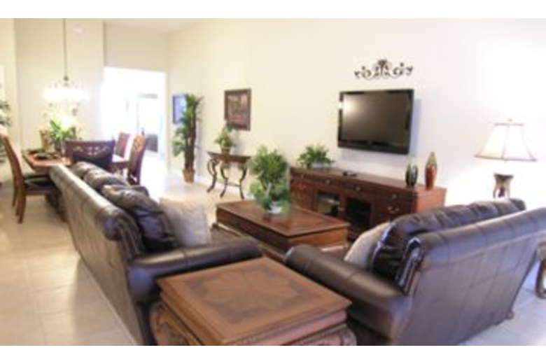 This large 4 bedroom, 4 bath home boasts a pool and spa, 5 DVD players, a game room and game system. 42" TV in living room plus 4 additional TV's. Game room is in garage and includes dart board, foosball, and pool table. Two of the bedrooms have luxurious king sized beds while the remaining two come with 2 twin beds in each room. This beautiful home easily sleeps 8 people.Surrounding Description