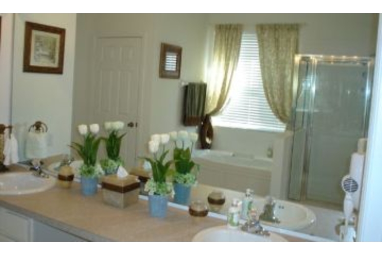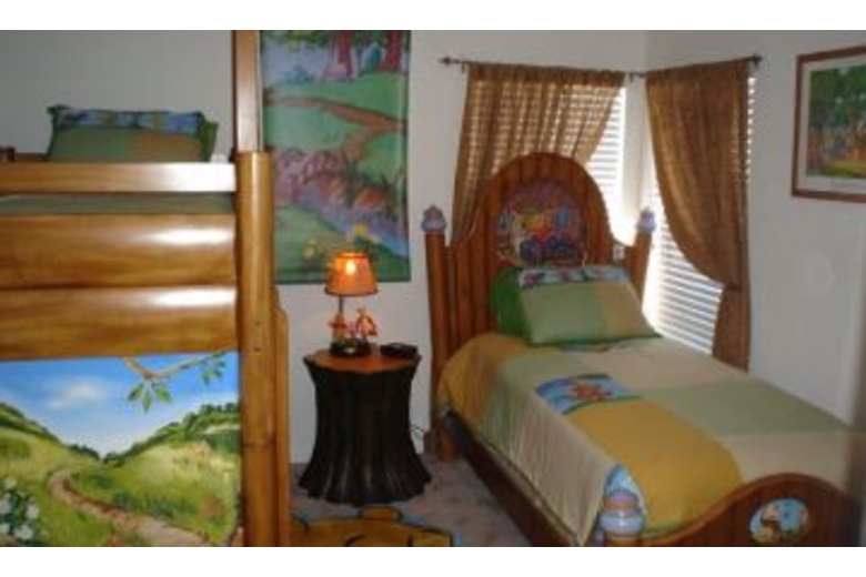 There are two master suites, each with king size beds, walk-in closets, and en-suite bathroom, plus a third bedroom with a queen size bed and closet. The second floor provides two Disney themed Winnie the Pooh and Mickey Mouse bedrooms, each designed to excite and enchant the imaginations of children, plus a third beautifully decorated large bedroom with double full size beds and walk-in closet. All 6 bedrooms come with flat-screen TVs, full cable, a/c, central heating, and over-head fans. The living room has a sofa-bed option, complete with a wall-size flat-screen television, DVD/ VCR player, and sound system. The kitchen is large and ready for all of your cooking and dining needs.Surrounding Description