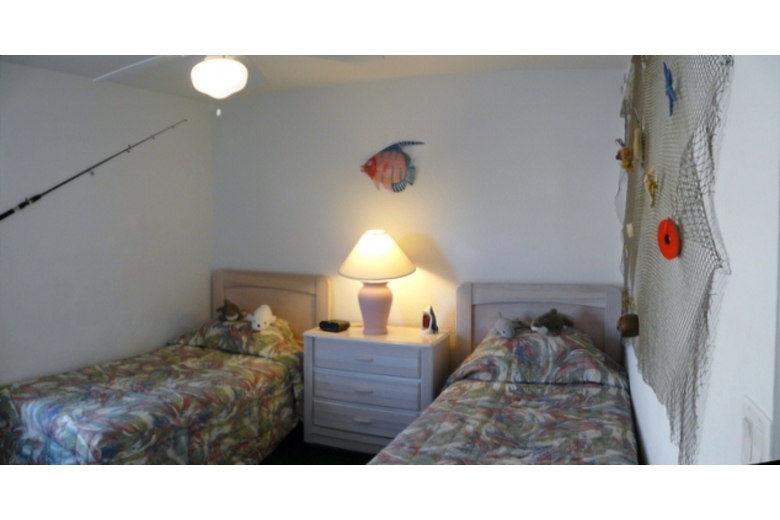 Aqua Bedroom – The decoration is water themed and the room has twin beds,