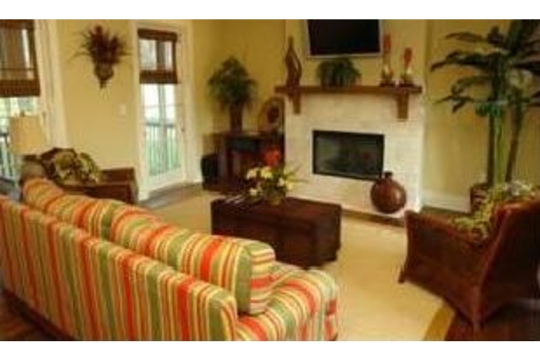 This house has large front porch. Living area has hardwood floors with fireplace, plasma tv, sleeper sofa and screened patio. Dining area can seat ten people. Kitchen has stainless appliances with granite countertops.Queen bedroom, tv, with bath. The second floor has a huge king master bedroom with fireplace, 32" plasma tv,large bath and private screened patio. Queen bedroom with bath, 20 " tv. Tray ceilings throughout. Also laundry room.Surrounding Description