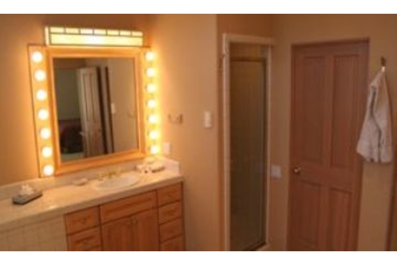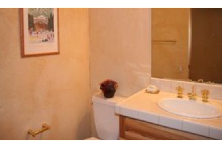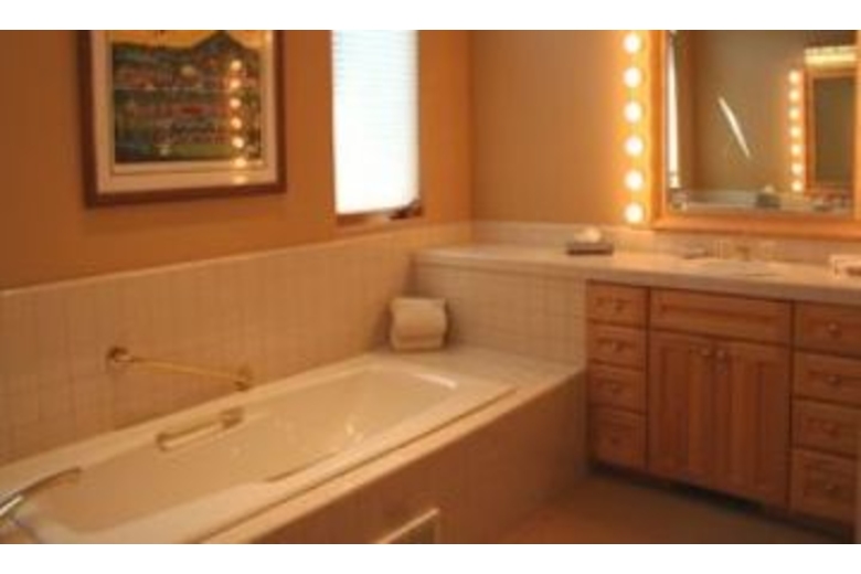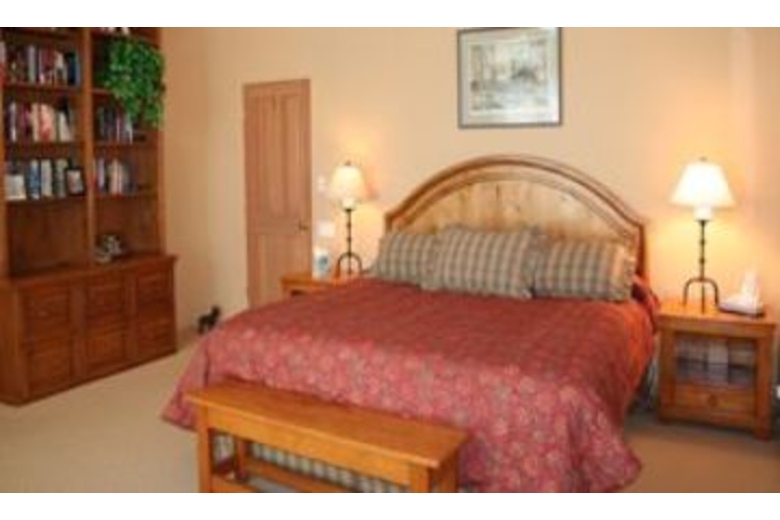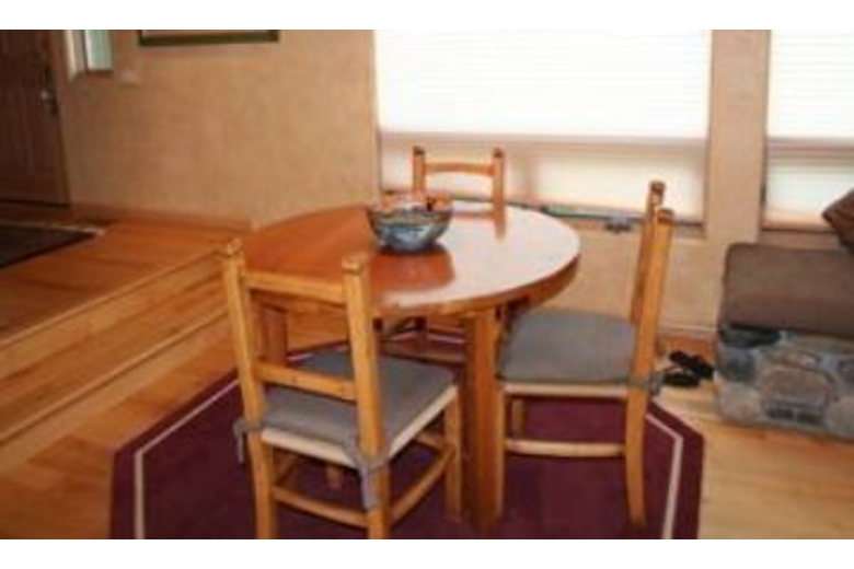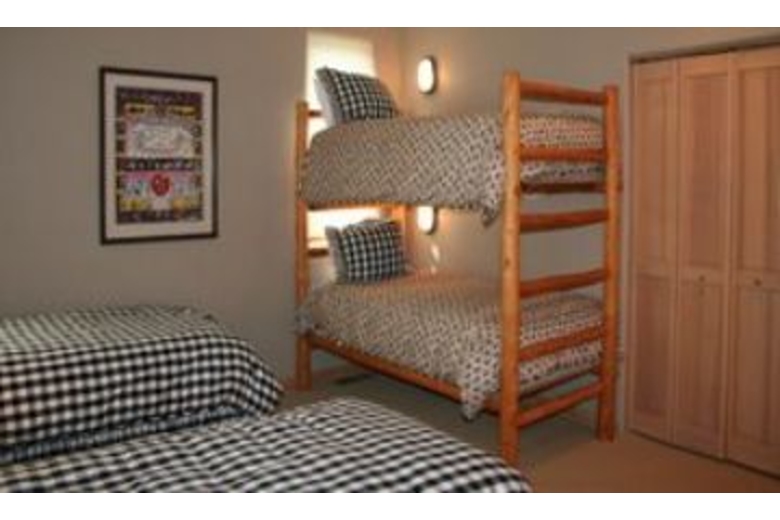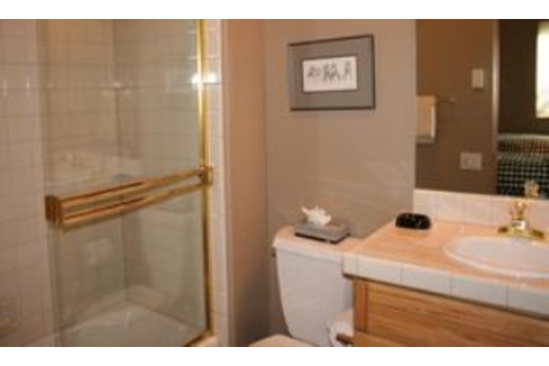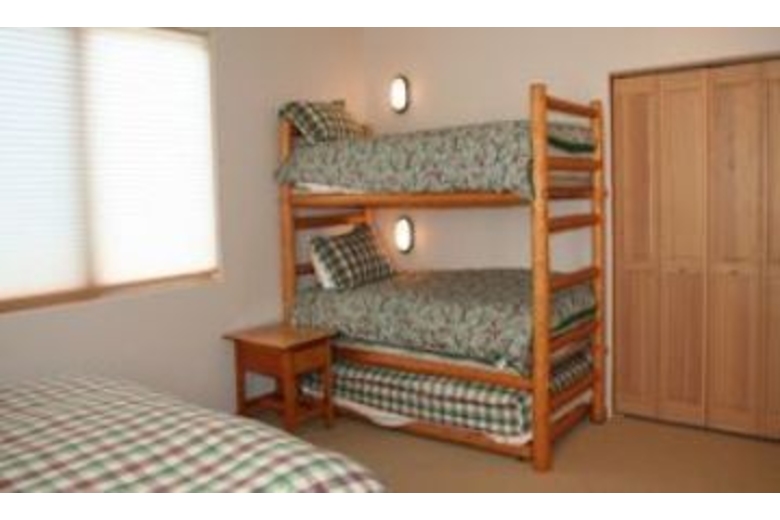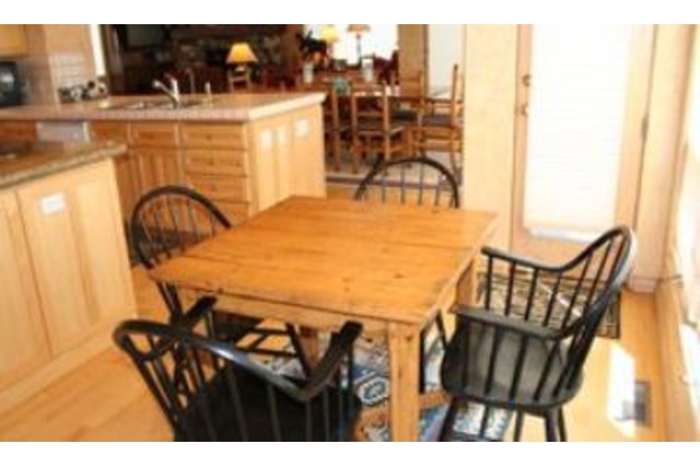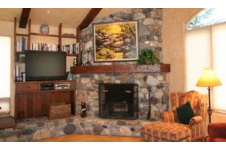 The open kitchen is equipped to handle extended families with ease. It has a bar interface to the dining area. There is a microwave, a dishwasher, and an automatic ice maker. The handmade log dining table will seat 10 easily. There is additional space for diners at the game table and there is also space at the breakfast table. The great room is a high-ceiling room which encompasses a nice seating area around the river rock fireplace as well as a game table, and the dining area. There is a river rock gas-igniting wood fireplace and a TV with VCR. To accommodate groups with adults and children, one of the bedrooms is set up with a second TV and VCR for the children.Surrounding Description