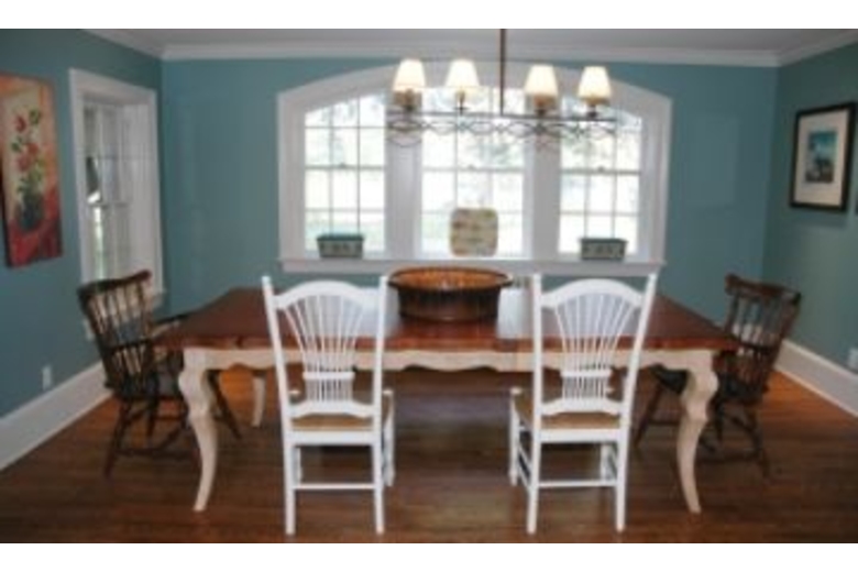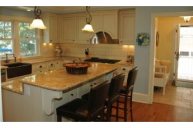 This five bedroom and four bathroom rental has a wonderful French Country charm. You will love the hardwood floors found throughout the living, dining, and kitchen areas. The living room has beautiful furnishings and a wood burning fireplace perfect for those cool autumn nights. The inviting dining area has a wood table that will seat six guests at mealtime. The stunning kitchen is fully equipped with all your cooking needs and has a large island with gorgeous granite counters and a breakfast bar that will seat three. The bedding, which will sleep twelve guests peacefully, includes two king bed, three twin beds, a double bed with a trundle, and a sofa sleeper. Dive into the pool after grilling up some barbeque with family and friends.Surrounding Description