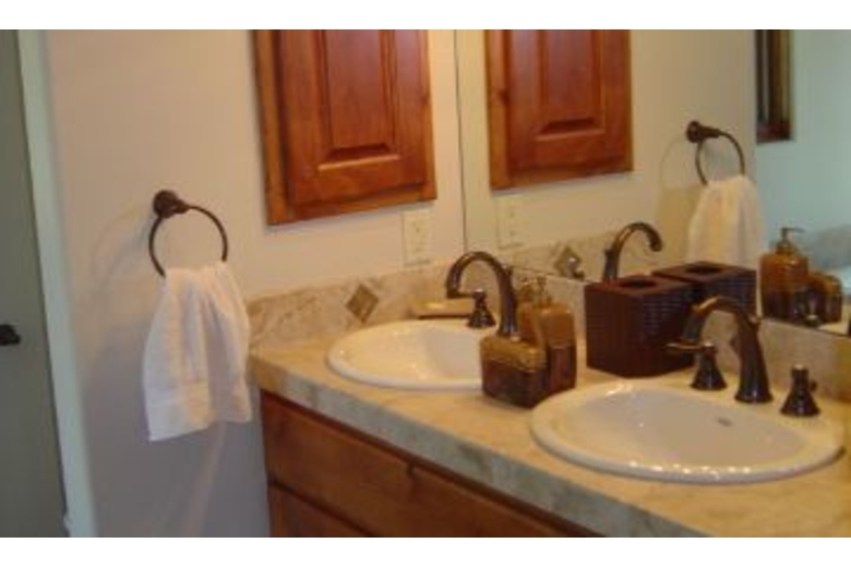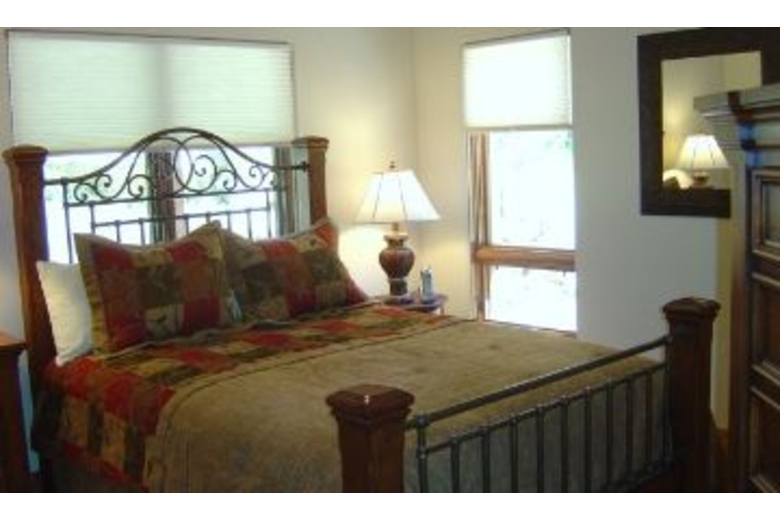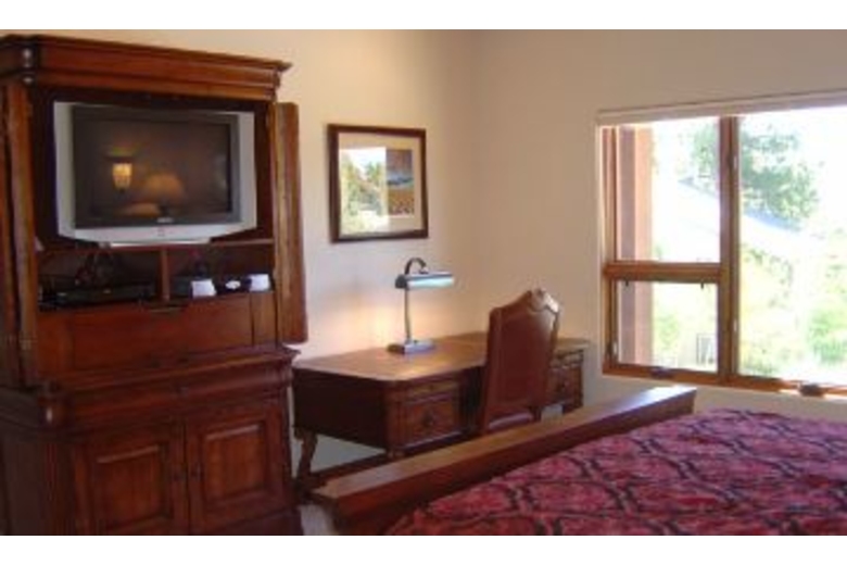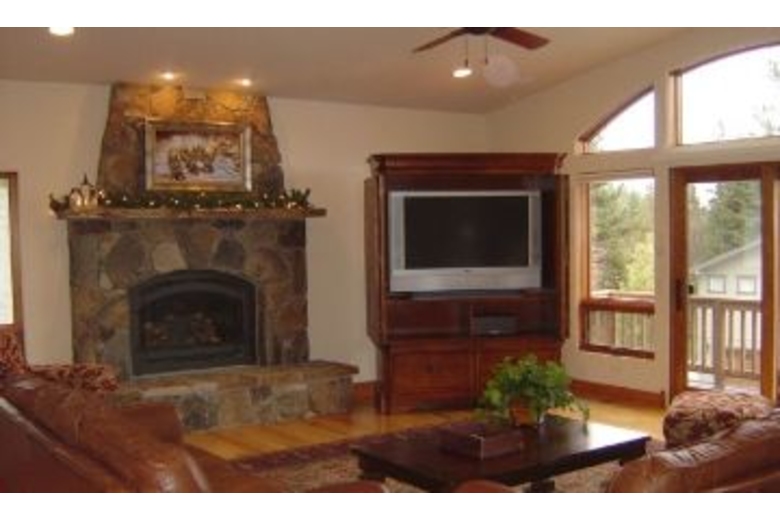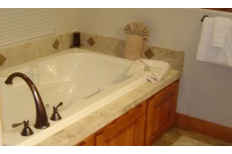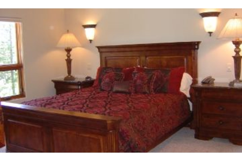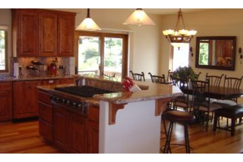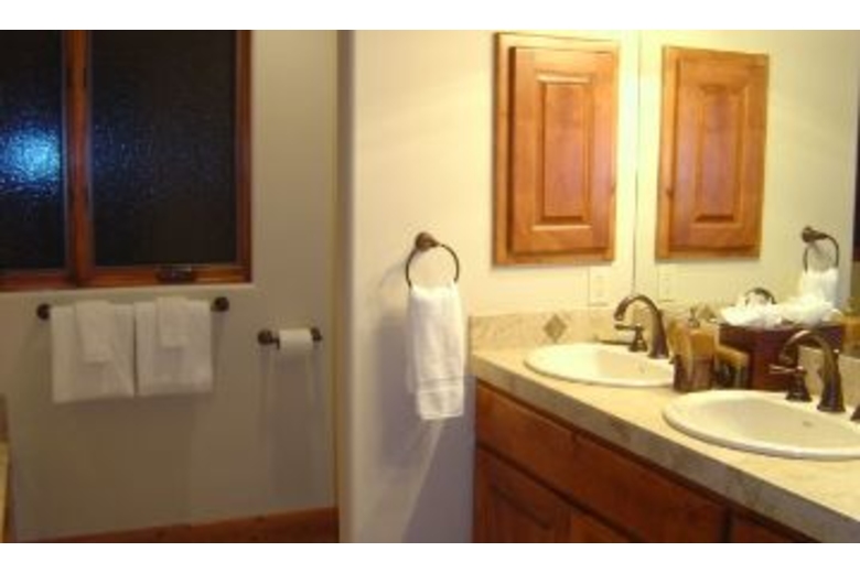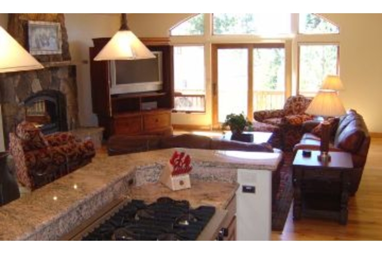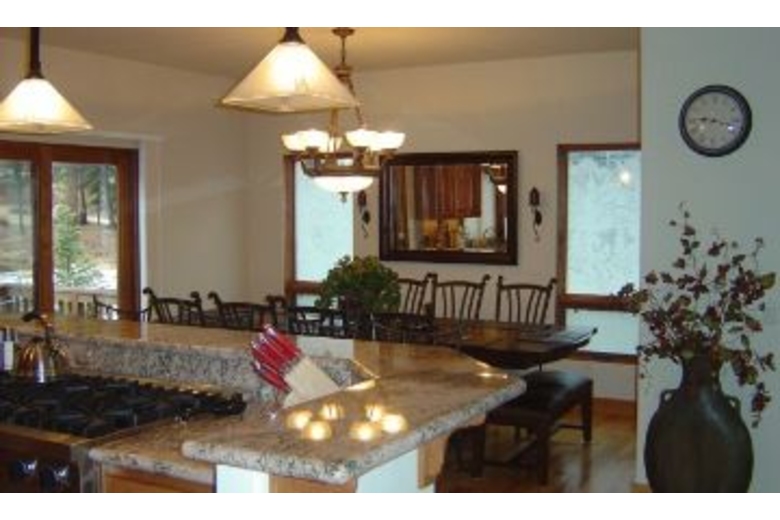 On the lower level you will find a second master suite with a luxurious queen bed and its own private bathroom complete with a shower and tub. Third bedroom with two sets of bunkbeds (4 twins), A full bathroom is next to the third bedroom. The family room/den has an armoire equipped with a 30 inch slim HD TV and DVD/VCR player. Children and adult games, puzzles and cards are provided. On the upper level is a master suite with a deluxe king bed, an armoire with a 30 inch slim HD TV and DVD player, an executive desk, & a roomy walk-in closet. Soak in the Jacuzzi Jetted Tub while gazing at the national forest. Exquisite use of slate, stone, travertine, and marble in every bathroom and entry way. The gourmet kitchen boasts a six burner Viking gas cook top, a KitchenAid built-in refrigerator, double convection oven, a toaster oven, a blender, a quiet dishwasher. Beautiful new pots, pans, and cookware will make cooking fun. Knotty alder wood cabinets are finished with elegant slab granite countertops. A large island seats four and the dining table accommodates up to twelve. A half bathroom is also located on this level.