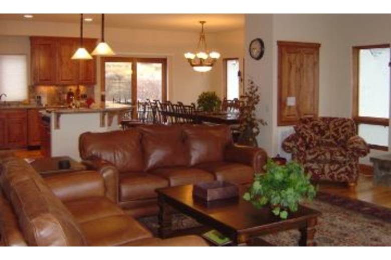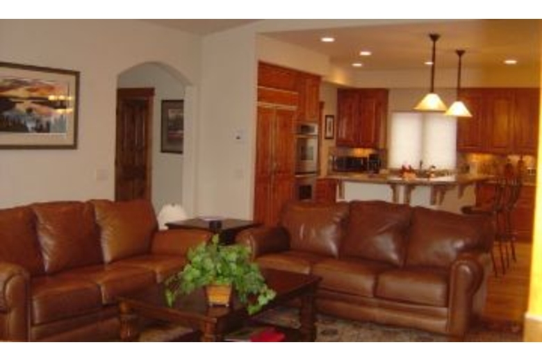 The kitchen looks unto a great room where all can be seated and enjoy each others company. Two leather couches & two oversized chairs are perfect for relaxing. Gleaming hickory hardwood floors embrace the commanding stone fireplace. There you will also find a 50 inch Sony Grand Wega XBR high definition television in an attractive armoire complete with DVD/CD player, surround sound, dish network, wireless DSL and whole house music system.Surrounding Description