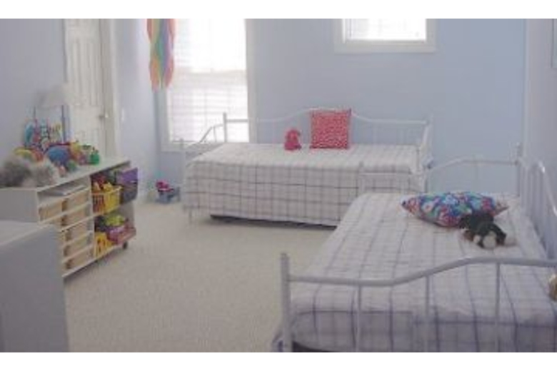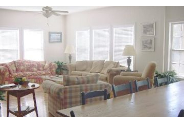 This nicely decorated vacation home offers five bedrooms and five bathrooms. This large and spacious home has hardwood floors throughout the living, dining, and kitchen areas. The living room has plenty of seating perfect for entertaining, cable television, and a VCR/DVD player. The dining area has a large wood table that will seat ten guests. The kitchen is fully equipped and has a breakfast bar with additional seating for two. The bedding, which will sleep twelve guests peacefully, includes three queen beds and six twin beds. Note: there is a youth toddler bed available as well. Step out onto the screened in porch and enjoy the coastal wildlife.Surrounding Description