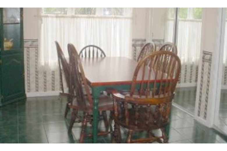 Enjoy a cozy beach home for your next family vacation. The living area is nicely furnished with a leather couch. The kitchen is fully equipped with all the appliances you’ll need. The dining area features a lovely table the whole family will enjoy and access to the deck.This home features five bedrooms to comfortably sleep a group of twelve. The first bedroom features a queen bed in beautiful rose bedding and matching curtains. The second bedroom will make you feel like you are in a garden with its green furniture and floral queen bed. The third bedroom features a queen along with a day bed and trundle. The fourth bedroom features an elegant queen bed. The fifth room is perfect for the kids and features a twin bunk bed.Surrounding Description
