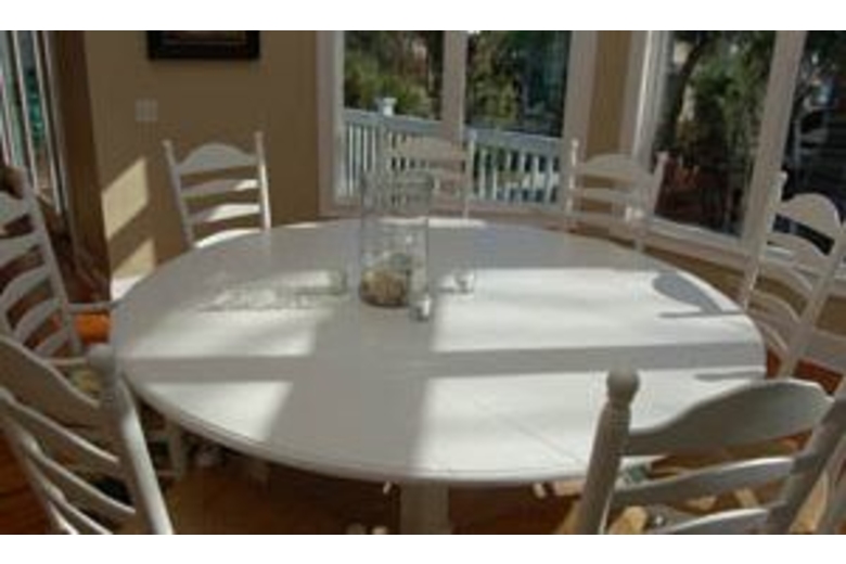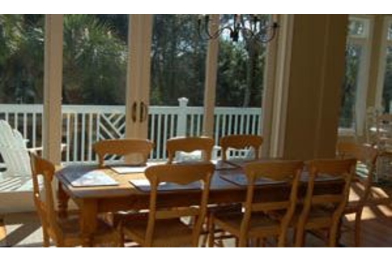 The first floor features include ten foot ceilings, a family room with TV and DVD player that opens to a porch and decking that leads to the pool and four bedrooms, all with TVs. The two bedrooms with twin beds open to porches overlooking the pool and the king bedroom opens to the front porch. The first floor also has a half bath and a laundry room with washer and dryer . The second floor features include, ocean views from several rooms, high ceilings, hearts of pine flooring, two decks(front with ocean view, back overlooking the pool ) and a half bath. There is an oversized kitchen with granite countertops, TV and a table that seats eight. The dining room has a round table that sits ten comfortably. There is a large family room with two large sofas, decorative fireplace,TV, VCR and DVD. The two master bedrooms, each with TV, VCR, have access to the back deck. The oversized bathrooms include separate showers and whirlpool tubs. The large pool area features a table with umbrella and chairs and seven lounge chairs. The deck off the kitchen includes table and chairs and a propane gas grill. All the porches have rocking chairs and fans.Surrounding Description