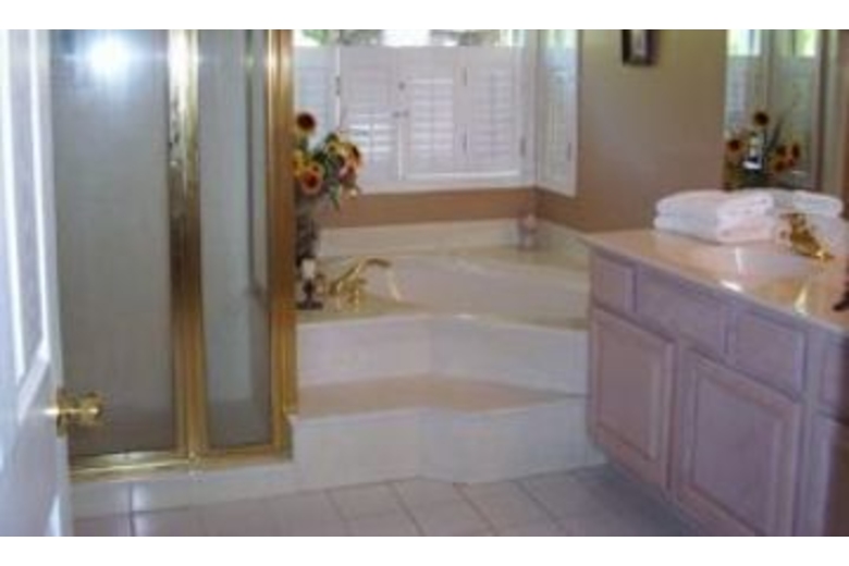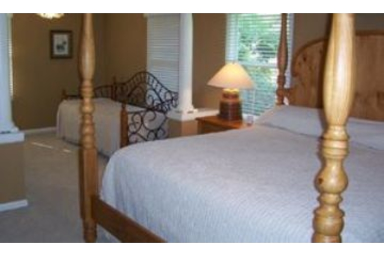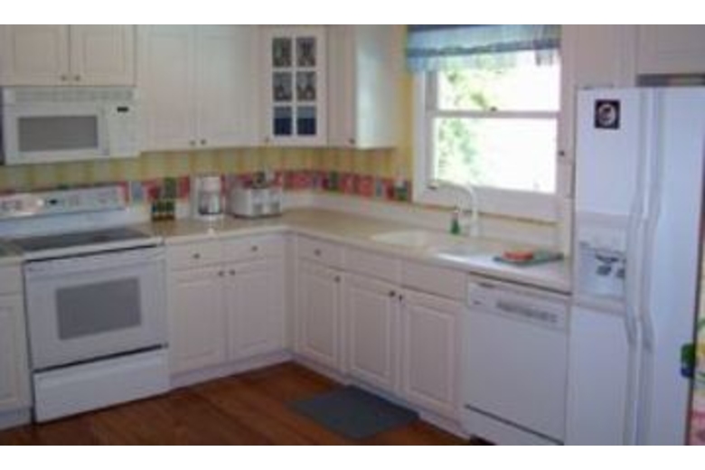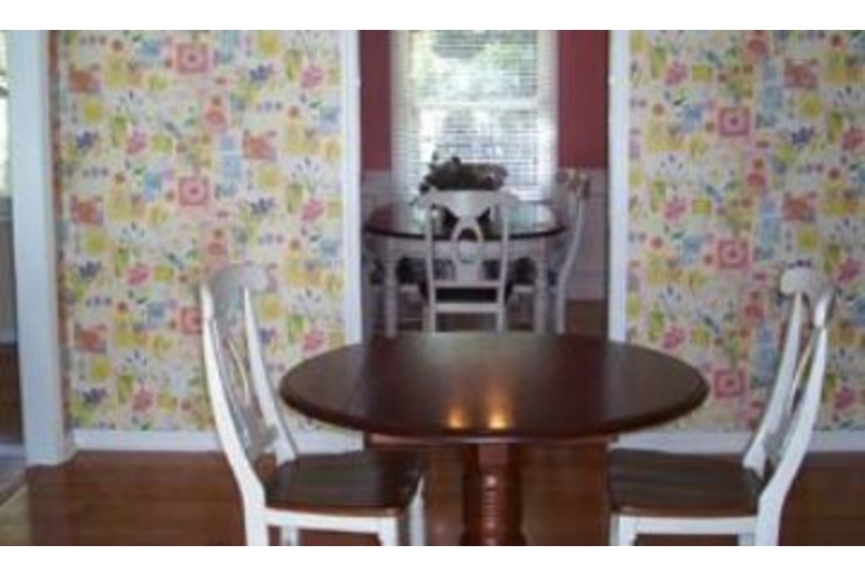 As you enter the open living room you will find a loveseat, four chairs, TV, DVD player, and door to the back deck. The living room overlooks the entire large backyard and private pool. To the left of the living room is the updated kitchen featuring heart of pine floors that is fully equipped and has an eat in area for four. The dining room has seating for ten. There is a comfortable den with a sleeper sofa, desk with wireless internet, and TV w/DVD. The master bedroom is off the den with a king bed, single daybed, TV, and private bath with jetted tub and separate glass shower. The washer and dryer is located in a closet in the master bedroom suite. To the right of the living room are three additional bedrooms. The first is a queen bedroom with a bathroom located across the hall with a tub/shower combination. The second bedroom has a queen bed and shares the bathroom with the first queen bedroom. A second master with king bedroom is located across the hall and has a private bathroom with tub/shower combination. There is a door to the back deck and has a pool view. The back deck has a dining table for four, with additional seating and a new gas grill. Fourteen steps lead down to a gated pool area with lounge chairs and additional chairs for seating. The pool is approximately 15 x 31 and has a jacuzzi. A sliding glass door leads to a downstairs room with a dining table, mini kitchen including a refrigerator and microwave, and bathroom with a shower. Wireless internet is available to guests at no additional fee.Surrounding Description