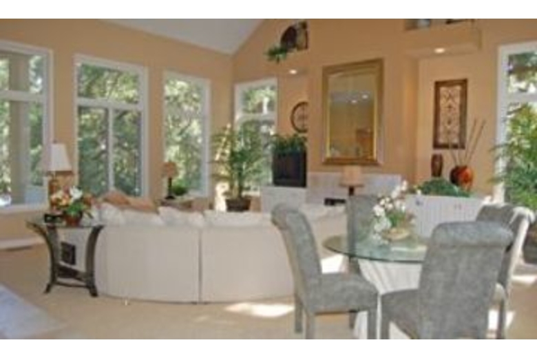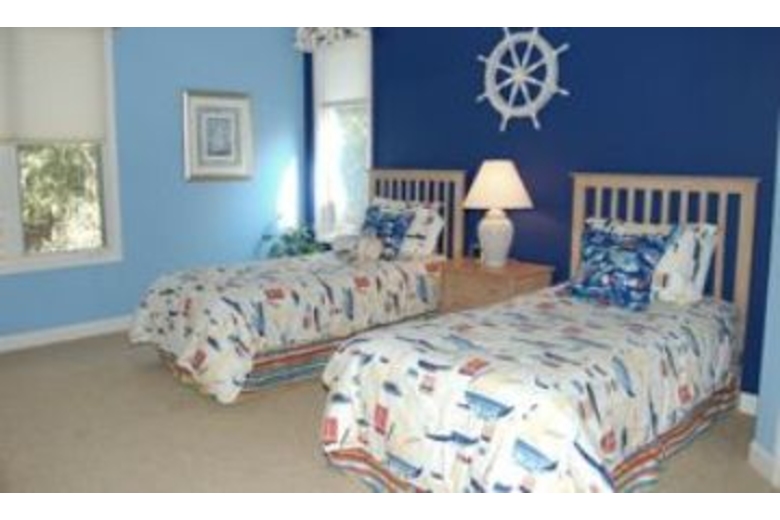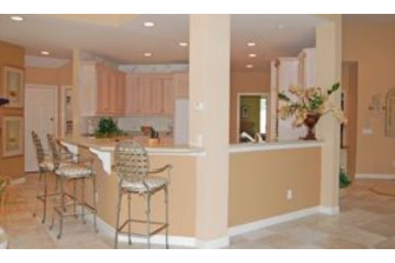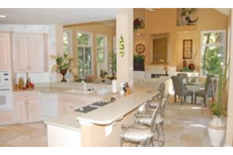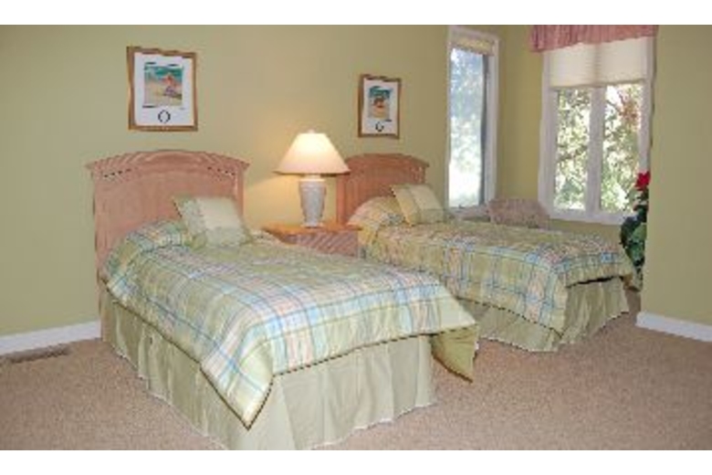 The dining room has a white washed pine table with room for eight. This room connects to the kitchen with an eat-in bar area for three. The living area has cathedral ceilings, a sectional tan sofa, large overstuffed chair, and game table with four chairs. In addition, you will find this designer decorated room has a large TV, VCR, and stereo with CD player. The master bedroom is located on the main level, and features a king bed, TV, private bath with jacuzzi tub and separate shower, and doors that lead to the back deck with pool and golf views. Two more bedrooms on this floor have two twin beds in each, one of the twin bedrooms has TV and VCR. Upstairs, you will find a large landing area with a sofa bed. The fourth bedroom has two queen beds, a TV/VCR, and private bath with garden tub and separate shower.Surrounding Description
