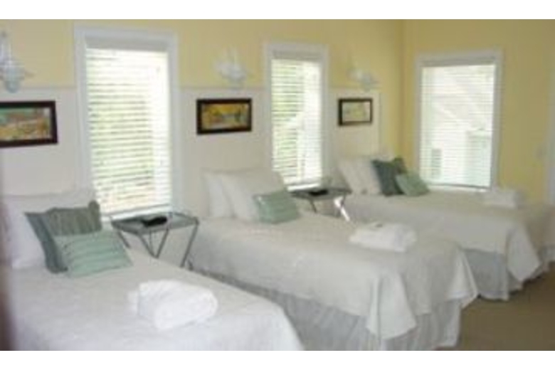 The house features three floors above parking, with seven bedrooms, six full baths, and two half baths. (The third floor club room with a sleeper sofa makes the 7th bedroom.) The first floor has an open family room with a flat screen TV/DVD, Bose surround sound system, a large custom kitchen with granite counter tops, stainless steel appliances and large eating area adjacent to the screened in porch. Also on the first level is a bedroom, laundry room and powder room. Just outside the main living room is the pool, sundeck, hot tub and gas grill. The second floor has three bedrooms. The third floor has two additional bedrooms and the club room. The first bedroom, located on the first floor, has 2 queens, TV/DVD, and private bath with tub/shower combination. On the second floor, the next bedroom has a king, TV/DVD, and private bath with tub/shower combination. Two more bedrooms are on this level. One has two queens, TV/DVD, and private bath with tub/shower combination. The next is a master suite and is furnished with a king, TV/DVD, private bath with jetted tub and separate shower, and a door to a private balcony overlooking the pool. The second master is located on the third floor. It features a king bed, TV/DVD, private bath with shower, and door to a balcony (shared with the club room) which overlooks the ocean. The next bedroom has 3 twins, a set of bunk beds, TV/DVD, and private bath with a shower. The final bedroom is the club room with queen sleeper sofa, plasma TV/DVD, Bose surround system, kitchenette with icemaker, refrigerator, dishwasher, sink, microwave, and table that seats 4. This room has a door to a large balcony with a slight ocean view.Surrounding Description
