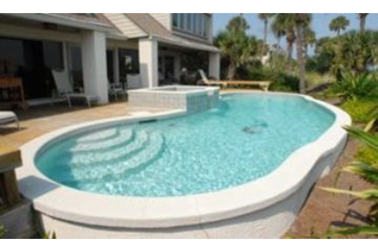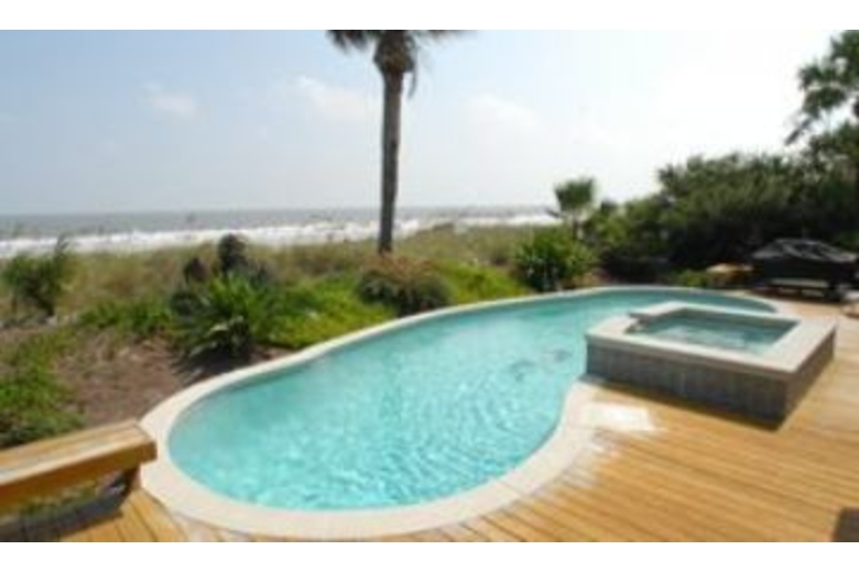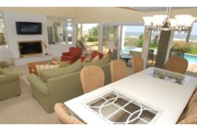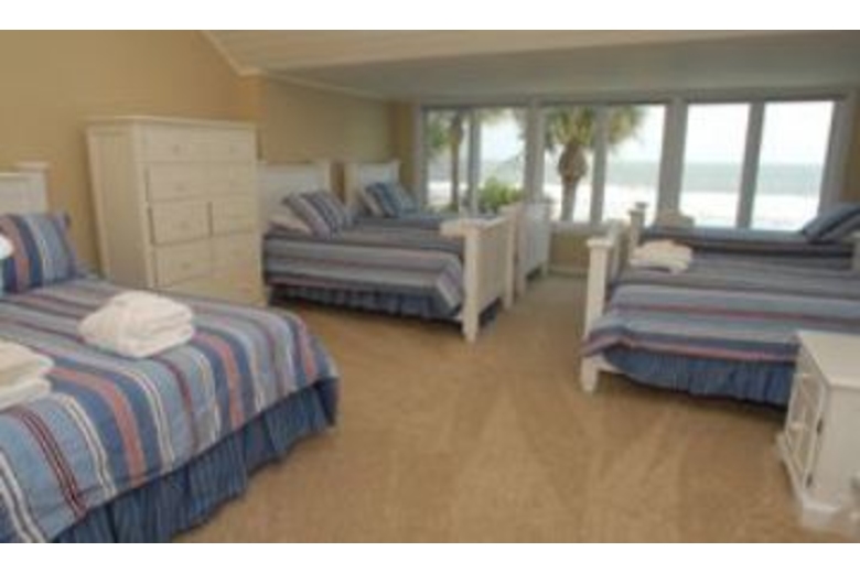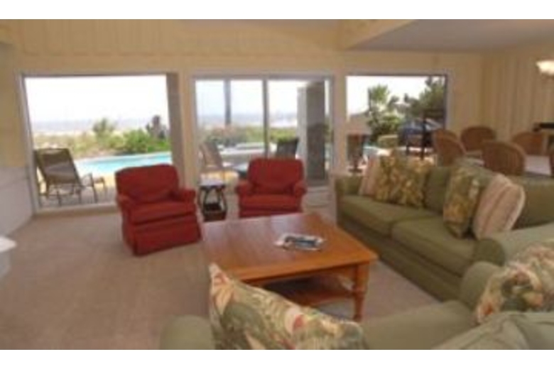 Upon entering the home, there is high ceilings and a large living area with plenty of seating and a large plasma TV and DVD. To the right of the living area is a dining room for 6. The kitchen has granite countertops, stainless steel appliances, hardwood floors, and every amenity to make the guest feel right at home. Down the hall from the kitchen is a laundry room with plenty of cabinet space and full-size washer/dryer. Down the hall is a room that can be used as a bedroom or media room, complete with a plasma TV and doors for privacy. On the other side of the house is a bedroom with two twin beds and a bathroom. The master suite has a king bed, TV/DVD, sitting area, great views of the ocean, and a private slider out to the deck Continue upstairs and there are four more bedrooms and a lounging area - perfect for reading the morning paper and relaxing. The first bedroom has a king bed and TV. The second bedroom has 1 king, 4 twins, TV and incredible views of the beach. Down the hall are two more bedrooms. The first bedroom has 2 kings and a TV. The other bedroom has a king bed and TV. Both rooms have exceptional views. Swinging doors may be used for privacy at opposite ends of the hallway. The oceanfront pool is the perfect setting for lounging, grilling, and relaxing. The deck comes equipped with a premium Weber Platinum propane grill and a grilling and prep area for the chef. The large kidney shaped pool is great for families and also has an elevated jacuzzi that waterfalls into the pool.Surrounding Description