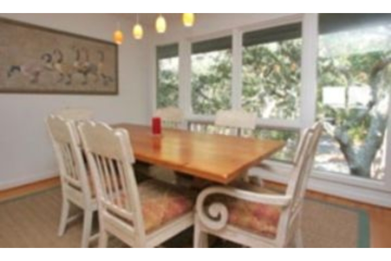 This home has a great foyer and living area with game table and a door to the screened porch. Upstairs, enjoy relaxing in the eclectic, and comfortable, furnishings, while fixing drinks at the wet bar, or watching TV or a movie on the VCR. In addition, there is a surround-sound stereo system with CD player. The eat-in kitchen has an island range with its own indoor grill. The mirrored backsplash creates a feeling of spaciousness, and light, and there are small ocean views from the kitchen windows.Surrounding Description