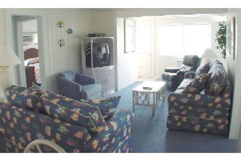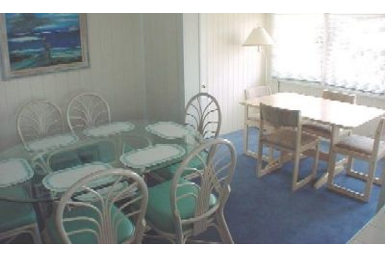 This eight bedroom, five bathroom home is located across the street from the beach. The living area offers comfortable furnishings. The kitchen is nicely equipped and the dining area has two dining room tables. One table is set up for six guests, the other is set up for four. There are three queen beds upstairs and three queen beds downstairs. There is also a futon upstairs. One of the bedrooms has a bunk bed with double size mattress on the bottom and a twin size mattress on the top. Another room has two twin beds. This house also comes with a washer and dryer, grill, four cable TVs, and two VCRs.Surrounding Description